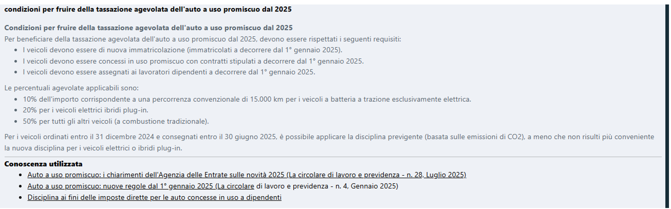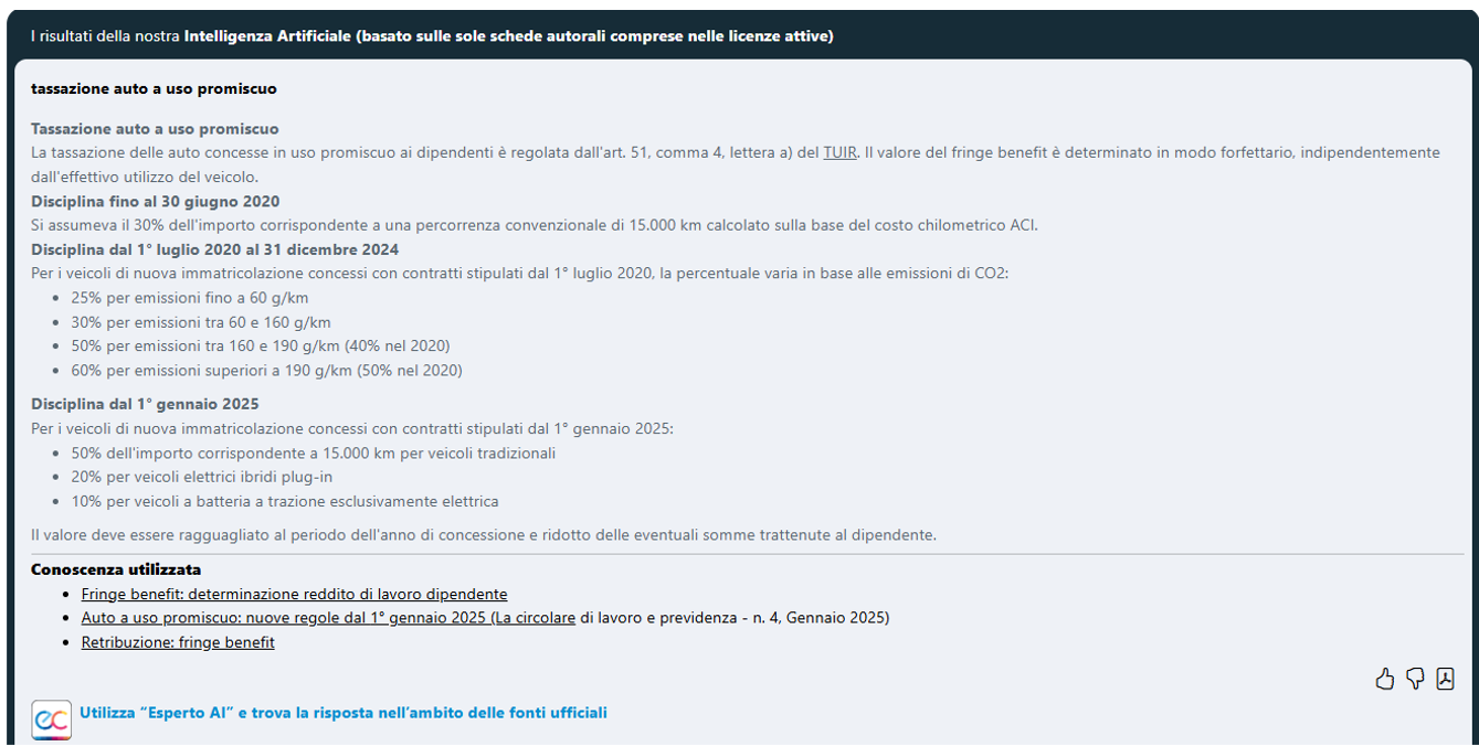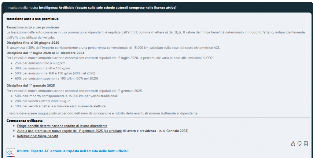La concessione dell’auto aziendale ad uso promiscuo rappresenta uno dei benefit più apprezzati dall’organico lavorativo. La relativa disciplina fiscale, recentemente, è cambiata più volte, ma con l’utilizzo di Esperto AI Lavoro possiamo avere un quadro preciso e sintetico della normativa applicabile.