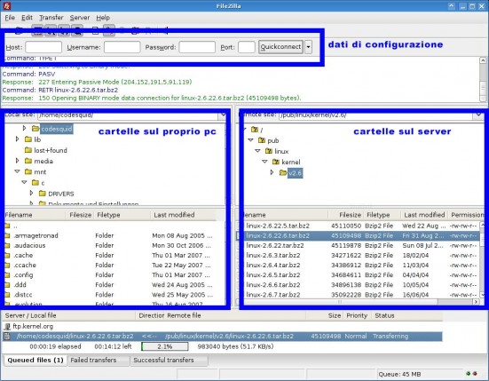 Nelle due grandi finestre sottostanti troveremo sulla sinistra le cartelle presenti sul nostro computer, sulla destra le cartelle presenti sul server del servizio di hosting. Ora possiamo gestire il trasferimento file tra PC e Server con un semplice “trascina”.