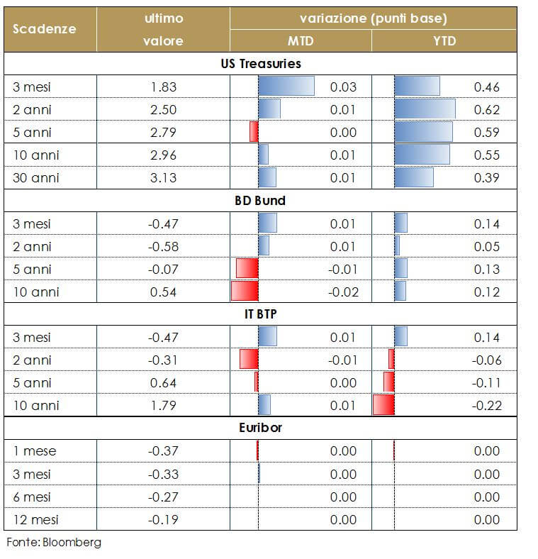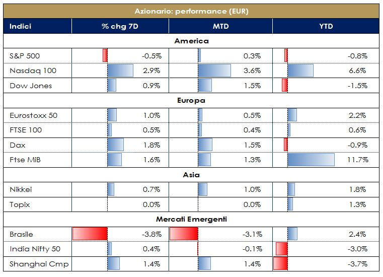 Il presente documento (il “Documento”) è stato preparato dalla Funzione Investment Advisory di Mediobanca SGR SpA (la “SGR”) a scopo puramente informativo. Il documento non ha carattere di offerta, invito ad offrire, o di messaggio promozionale finalizzato all’acquisto, alla vendita o alla sottoscrizione di strumenti/prodotti finanziari di qualsiasi genere. Inoltre, esso non è inteso a raccomandare o a proporre una strategia di investimento in merito a strumenti finanziari. In particolare il presente Documento non costituisce in alcun modo una raccomandazione personalizzata; lo stesso è stato predisposto senza considerare gli obiettivi di investimento, la situazione finanziaria o le competenze di specifici investitori. Il presente Documento è proprietà di Mediobanca SGR; esso non può essere riprodotto o pubblicato, nemmeno in una sua parte, senza la preventiva autorizzazione scritta della SGR. Le informazioni, opinioni, valutazioni e/o previsioni contenute nel presente Documento (le “Informazioni”) si basano su fonti ritenute autorevoli ed attendibili; tuttavia, la SGR non assume alcuna responsabilità per eventuali errori od omissioni né potrà considerarsi responsabile per le eventuali perdite, danni o conseguenze di qualsivoglia natura (legali, finanziarie o fiscali) che dovessero derivare dal fatto che si sia fatto affidamento su tale Documento. Ciascun investitore dovrà pertanto assumere le proprie decisioni di investimento in modo autonomo, tenuto conto delle sue caratteristiche e dei suoi obiettivi di investimento, e a tale scopo non dovrà basarsi, prioritariamente o esclusivamente, sul presente Documento. I rendimenti passati, eventualmente rappresentati nel Documento, non sono indicativi né garantiscono gli stessi rendimenti per il futuro. Le Informazioni contenute nel presente Documento costituiscono valutazioni aggiornate alla data della sua produzione e potrebbero variare nel tempo, senza necessità di comunicazione da parte della SGR.