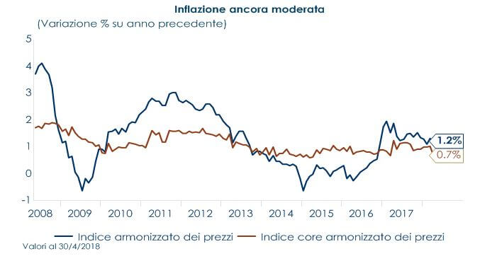 Rimanendo in tema di prezzi, l’indice dei prezzi alla produzione (PPI) ad aprile è cresciuto dello 0,1% m/m, in linea con le attese, portando la crescita su base annua a salire da 1,6% a 2,1%. Le vendite al dettaglio in T1 hanno rallentato nel primo trimestre dell’anno: a marzo sono aumentate dello 0,1% m/m (consenso: 0,5% m/m) portando il tasso di crescita annuale a 1.8% a/a e il tasso trimestrale -0,2% t/t, dopo essere aumentate dello 0,4% in T4 2017. Insieme ai dati sulle nuove immatricolazioni di autoveicoli, il dato suggerisce che la crescita trimestrale dei consumi delle famiglie ha rallentato nuovamente, contribuendo al calo della crescita complessiva del PIL dallo 0,4% allo 0,4% in T1. Tuttavia, le prospettive per le vendite al dettaglio sembrano positive per i prossimi mesi: le indagini sulle imprese suggeriscono che la disoccupazione continuerà a diminuire e la fiducia dei consumatori rimane ad un livello coerente con una crescita annuale delle vendite al dettaglio di circa il 3%. In settimana è stata pubblicata la stima preliminare del PIL di T1 dell’Area Euro conferma le aspettative degli operatori mostrando una crescita in rallentamento allo 0,4% t/t dopo il robusto 0,7% t/t (rivisto al rialzo di un decimo) del trimestre precedente. La crescita tendenziale si assesta così a 2,5% a/a, in linea con le attese ed in calo di 3 decimi dal 2,8% a/a di fine 2017 (anch’esso rivisto al rialzo di un decimo).