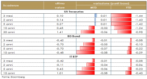 MERCATI DEI TITOLI GOVERNATIVI Questa settimana l’adozione di una nuova strategia di politica monetaria da parte della FED ha continuato ad attrarre l’attenzione degli operatori di mercato, esercitando una pressione al ribasso sui rendimenti dei titoli governativi dei principali paesi sviluppati. Come anticipato da J. Powell, questa settimana è stato compito dei membri del FOMC commentare le modifiche apportate alla strategia di politica monetaria (modifica dell’obiettivo di inflazione che dovrà compensare periodi di under-shooting con periodi di moderato over-shooting, ed eliminazione del bias ad alzare i tassi in caso di disoccupazione al di sotto del livello di più lungo termine). In particolare, hanno sorpreso i toni dovish del governatore Brainard, che ha osservato che ” sarà importante che la politica monetaria passi da una fase di stabilizzazione a una di stimolo”. Secondo Brainard, la probabilità che l’aumento della disoccupazione diventi permanente e che le imprese falliscano sta aumentando con l’estensione nel tempo dell’incertezza collegata al virus. Brainard ha anche avvertito però che il nuovo framework potrebbe aumentare i rischi di instabilità finanziaria, con movimenti più ampi dei prezzi delle attività finanziarie, e massimi e minimi più estremi. Per questo sarà importante una regolamentazione efficace, come “prima linea di difesa” per permettere alla politica monetaria di fornire tutto lo stimolo necessario per raggiungere gli obiettivi di stabilità dei prezzi e massima occupazione. Clarida (vice-presidente Fed) ha, invece, indicato a cosa prestare attenzione all’avvicinarsi della riunione del FOMC del 16 settembre: il FOMC discuterà le modifiche alla forward guidance (che potrebbero riguardare le indicazioni sia sui tassi sia sugli acquisti di titoli) sulla base delle conclusioni della revisione della strategia di politica monetaria appena conclusa, ma non ha dato indicazioni sui tempi dei futuri cambiamenti. Le modifiche alla strategia di politica monetaria della Fed si sono chiaramente riverberate dall’altro lato dell’Atlantico, dove il capo economista della BCE, Lane, è intervenuto dichiarando che l’apprezzamento dell’euro avrà conseguenze per la politica monetaria dell’Area. I rendimenti sul mercato governativo europeo hanno così accelerato al ribasso, trascinati dal rally dei paesi periferici che agli occhi degli investitori sono sempre i maggiori beneficiari di mosse espansive da parte della BCE. In questo contesto particolare attenzione sarà rivolta alla riunione della BCE della settimana prossima, dove Christine Lagarde si vedrà costretta a mantenere dei toni molto dovish al fine di scongiurare un ulteriore apprezzamento dell’euro nei confronti del dollaro statunitense e a commentare i progressi della sua revisione strategica alla luce del discorso di Jackson Hole del Presidente Powell. La BCE pubblicherà anche le nuove previsioni di crescita ed inflazione, che dovranno riflettere le misure annunciate a giugno, incorporare il recente apprezzamento dell’euro e temer conto della notevole sorpresa al ribasso registrata dall’inflazione in agosto. PERFOMANCE DEI TITOLI DI STATO Dati aggiornati alle 17.30
