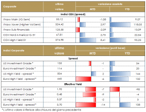 MERCATI DEI TITOLI CORPORATE La settimana che apre il mese di settembre ha vissuto due fasi, una prima di prosecuzione del rally degli ultimi mesi e una conclusione, in particolare nella sessione di giovedi’ in cui si è assistito ad una brusca pausa con prese di profitto e coperture sul mercato. Per il resto questa settimana è stata tutta incentrata sul mercato primario molto attivo come da attese con primi segnali di un mercato sostanzialmente arrivato al top, premi limitati sulle nuove emissioni e secondario che fa fatica a muoversi. Gli indici CDS sono tornati sui livelli di settimana scorsa con il XOVER che mercoledì trattava -20bp molto vicino alla soglia psicologica dei 300bp. In chiusura Main -1bps, Crossover +1bps, Financials -2bps e Subordinated -5bps.Sul secondario, dove le attese erano in prevalenza i flussi in vendita per far spazio alle nuove emissioni, si è invece assistito ad una buona tenuta grazie da un lato ai limitati premi di emissione e dall’altro da size inferiori alle aspettative sul primario dove sono stati emessi oltre 25Bio di euro in linea con l’ultima settimana a fronte di attese di 30Bio secondo Bloomberg e inferiore rispetto alla prima settimana di settembre dell’anno scorso 34Bio. Sul secondario il Corporate IG ha stretto di 5bps durante la settimana con una buona tenuta nel sell off di giovedì. AT1 e subordinati finanziari hanno sovraperformato gli ibridi corporate comunque positivi nella settimana. Nel mercato primario diverse offerte multi-tranche come Adidas (A+. 500Mio, 4y e 15y), Royal Schipol (A, 700Mio 7y e 500Mio 12y), American Tower (BBB-, 750Mio 7y e 650Mio 11y), il deal green di Daimler (BBB+, 1Bio 10y) e ERG (BBB-, 7y 500Mio), i deal di Glencore (BBB+ 850Mio 7.5y), Orano (BB+, 500Mio 7.5y) e i corporate Hybrid di Enel (BBB 600Mio, perp nc 6.5y) e Merck (BBB+, 1Bio perp nc6).Su financial invece settimana relativamente tranquilla con il nuovo green bond di Mediobanca (BBB, 500Mio 7y), il senior holdco di KBC (A-, 750Mio 5y) e l’atteso deal su Monte (CCC+, 10nc5y, 300Mio). A cura del team obbligazionario di Mediobanca SGR
