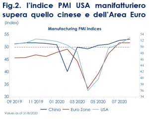 | Dopo il crollo della crescita in T2, con la graduale rimozione delle misure di chiusura a contenimento della pandemia l’economia mondiale si avvia a un lento ritorno alla crescita in T3 2020. Nei mesi estivi si è verificata una progressiva ripresa dell’attività economica nella maggior parte delle economie. Il nostro indicatore proprietario di ciclo economico, che mappa il momentum della crescita economica e dell’inflazione, pur restando in una fase di deterioramento (momentum di crescita e inflazioni entrambi negativi), suggerisce che l’attività economica è migliorata in misura significativa a giugno e luglio rispetto al punto di minimo registrato in maggio (Fig.1). Contestualmente, la percentuale ponderata per il PIL del numero delle principali economie che sperimentano una fase di espansione (momentum della crescita positivo) è tornata al 25% dopo il calo sotto il 10% in maggio. Anche gli indici PMI manifatturieri rilasciati in settimana confermano questo rimbalzo, mostrando che il ritorno alla crescita sarà più rapido negli Stati Uniti e in Cina che in Europa. E più veloce in Germania che nel resto dell’Area Euro. (Fig.2). Sebbene il livello puntuale dell’indice debba essere interpretato con cautela a causa della volatilità registrata dall’indice negli ultimi mesi, l’andamento degli indici PMI dei paesi sviluppati è, coerente con la previsione che la crescita del PIL dell’economie avanzate sia rimbalzata in territorio positivo all’inizio di T3, mentre il comparto manifatturiero dei paesi emergenti è tornato in una fase di espansione nel mese di agosto. Gli indici sottocomponenti mostrano che il miglioramento è diffuso e i nuovi ordini (componente leading dell’indice) hanno registrato un miglioramento costante.