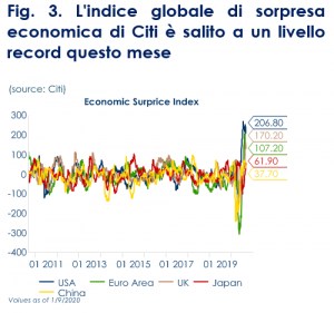 Fig.2. l’indice PMI USA manifatturiero supera quello cinese e dell’Area Euro Fig. 3. L’indice globale di sorpresa economica di Citi è salito a un livello record questo mese