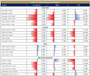 PERFORMANCE DEI MERCATI MERCATI AZIONARIAll’appello dei problemi questa volta i tecnologici rispondono “presenti”. Questa settimana abbiamo assistito alla forza dell’Euro sul dollaro US e al superamento del livello di cambio psicologico di 1,20 (valore registrato l’ultima volta nel 2018). Se in Europa i problemi sono valuta e inflazione, negli Stati Uniti il tema principale rimane l’occupazione: nel pomeriggio di venerdì sono usciti i tanto attesi dati americani i quali hanno positivamente visto 1,37 milioni di posti di lavoro creati ed un livello di disoccupazione dell’8,4%, a fronte di numeri stimati ben più pessimisti. Sui mercati azionari abbiamo assistito ad una brusca frenata dei tecnologici, i quali avevano raggiunto livelli oltre ogni aspettativa ragionevole: nella giornata di giovedì Apple ha registrato -8%, Microsoft -6% ed il listino Nasdaq 100 ha ceduto il 5% (valori che non si vedevano da marzo). Rimane l’interrogativo se si stia trattando di un profit taking o di un vero panic selling; il settore è caratterizzato da bilanci solidi, ampia liquidità per possibili buyback, business fitting con la transizione da covid19, EPS in crescita…ma a che prezzi (multipli)!?! Primo sentore di ripresa dei Finanziari considerando nuovi tassi. Volatilità attesa in rialzo, complici le ripercussioni da covid19 e l’esito (incerto e per qualcuno contestato) delle prossime elezioni americane. Mercati comunque vicini ai massimi, sostenuti dalla speranza di un prossimo vaccino e dagli stimoli fiscali e monetari messi in atto, vera dopamina dei listini. EuroStoxx flattish questa settimana a -0,30%, trainato dalle Materie Prime +5%, Auto +2,8%, HPC (Lusso) +2% e Chimici +1,20% contro Travel&Leisure -3,80%, Financials -2,40% e Tecnologia -2,10%. In termini di singoli titoli Suez +24%, Valeo +10,5%, Covestro +10% e Kering +8,90% i best performer contro HelloFresh -13%, Altice EU -9% e Nokia -8% i worst. Sul mercato italiano, FTSE MIB a -0,30% con Interpump +8,7%, Atlantia +6% e Moncler +5,4% contro BPER -8%, Saipem -5% ed STM -4,5%; mercato delle Mid&Small cap -0,14% con Mondadori +14%, Retelit +13% e Technogym +13%. S&P500 a -1,20% con CommChemical Idx +6,5% e DivChemical Idx +6% contro Software Idx -6%, Internet Home Ent -6% e Semis Equip -4%. Si segnala la continua crescita di inflow per i fondi equity “ESG oriented” (95 bn USD YTD). Come anticipato nello scorso settimanale, si conferma la revisione annuale dell’indice Euro Stoxx 50 il quale vedrà entrare a metà mese Adyen (pagamenti digitali), Prosus (servizi internet), Vonovia SE (real estate), Kone B (ascensori), Pernod Ricard e uscire Societè Generale, BBVA, Telefonica, Orange e Fresenius. A cura del teamCore Equity Value di Mediobanca SGR PERFOMANCE MERCATI AZIONARI Dati aggiornati alle ore 17.30