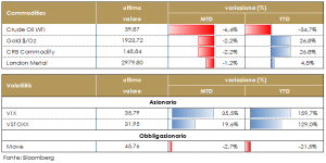 MATERIE PRIME E VOLATILITÀSettimana volatile per il prezzo del petrolio, che scende sotto il 40 dollari al barile archiviando il maggior calo settimanale da giugno. La debolezza del petrolio e un marginale apprezzamento del dollaro indeboliscono tutti i comparti delle materie prime. Dati aggiornati alle ore 17.30