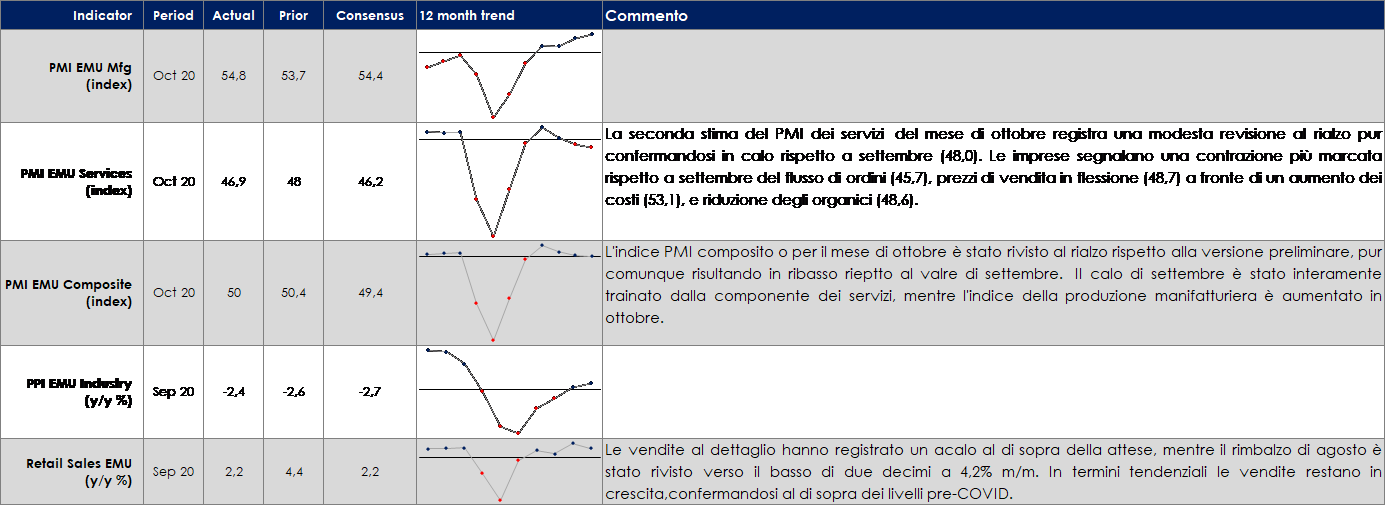 La CE ha pubblicato le previsioni macroeconomiche di autunno che, rispetto alle stime estive di luglio mostrano una revisione al rialzo delle stime per il 2020 e una limatura per quelle sul 2021. Le nuove previsioni sono state preparate con le informazioni disponibili fino al 22 ottobre e non riflettono le più recenti misure restrittive. Nel complesso dell’Area Euro si prevede una contrazione del PIL del 7,8% nell’anno in corso (rivista da 8,7% delle previsioni estive), coerente con un calo del PIL di 0,1% t/t in T4, e un rimbalzo del 4,2% in quello successivo (corretto da 6,1% precedente). Nel 2022 la CE stima un’espansione del 3,0%. Le ipotesi alla base delle stime autunnali sono un mancato accordo tra Regno Unito e Unione Europea con le relazioni commerciali tra le due aree che dovrebbero quindi basarsi, a partire dal2021, sulle regole del WTO mentre il possibile impatto del piano NextGenerationEU è stato incorporato nelle previsioni solo in misura marginale a causa della limitata visibilità sul futuro del piano.