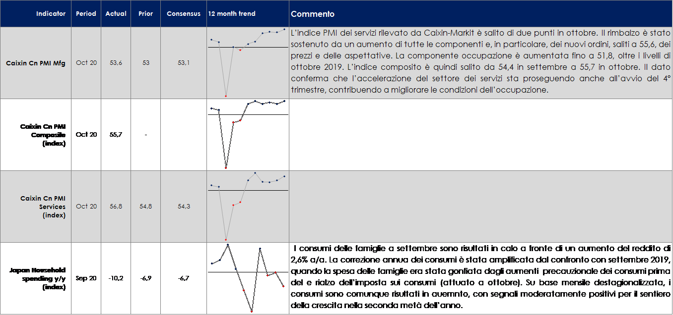 Ancora una volta i sondaggi si sono rivelati sbagliati e resta elevata l’incertezza su quanto tempo ci vorrà per conoscere il nome del futuro presidente degli Stati Uniti. L’esito potrebbe rimanere poco chiaro ancora per un certo periodo di tempo. Conseguentemente, i mercati sono rimasti sorprendentemente calmi e potrebbero evitare di muoversi decisamente in una direzione o nell’altra nei prossimi giorni. Sembra che il mercato stia valutando un “gridlock” politico (ossia uno scenario di stallo politico tra la Camera Democratica e il Senato Repubblicano), con poco spazio per una forte espansione fiscale o per riforme nel campo della sanità, dell’energia verde o delle infrastrutture e un maggior ruolo attivo della Federal Reserve, che dovrebbe continuare a sostenere l’economia con bassi tassi di interesse e nuovi programmi di acquisti di asset, con conseguente espansione del proprio bilancio. Da quando è iniziato lo spoglio elettorale non solo il rendimento dei titoli del Tesoro statunitense a 10 anni è sceso di circa 10 punti base (riflettendo sia la probabilità di un minor stimolo fiscale nel breve periodo, sia la domanda di safe-haven asset, in vista di un possibile voto conteso e di mesi di incertezza) ma anche i rendimenti dei titoli high yield sono scesi, L’azionario ha recuperato le perdite delle settimane precedenti riportandosi in prossimità dei massimi grazie soprattutto al recupero dei “big” della “digital economy” trascinati da un minor timore di interventi regolamentari. Debole il dollaro in questa fase di risk-on sebbene una ridotta possibilità di un accordo fiscale e una maggiore incertezza politica indicherebbero un dollaro più forte.