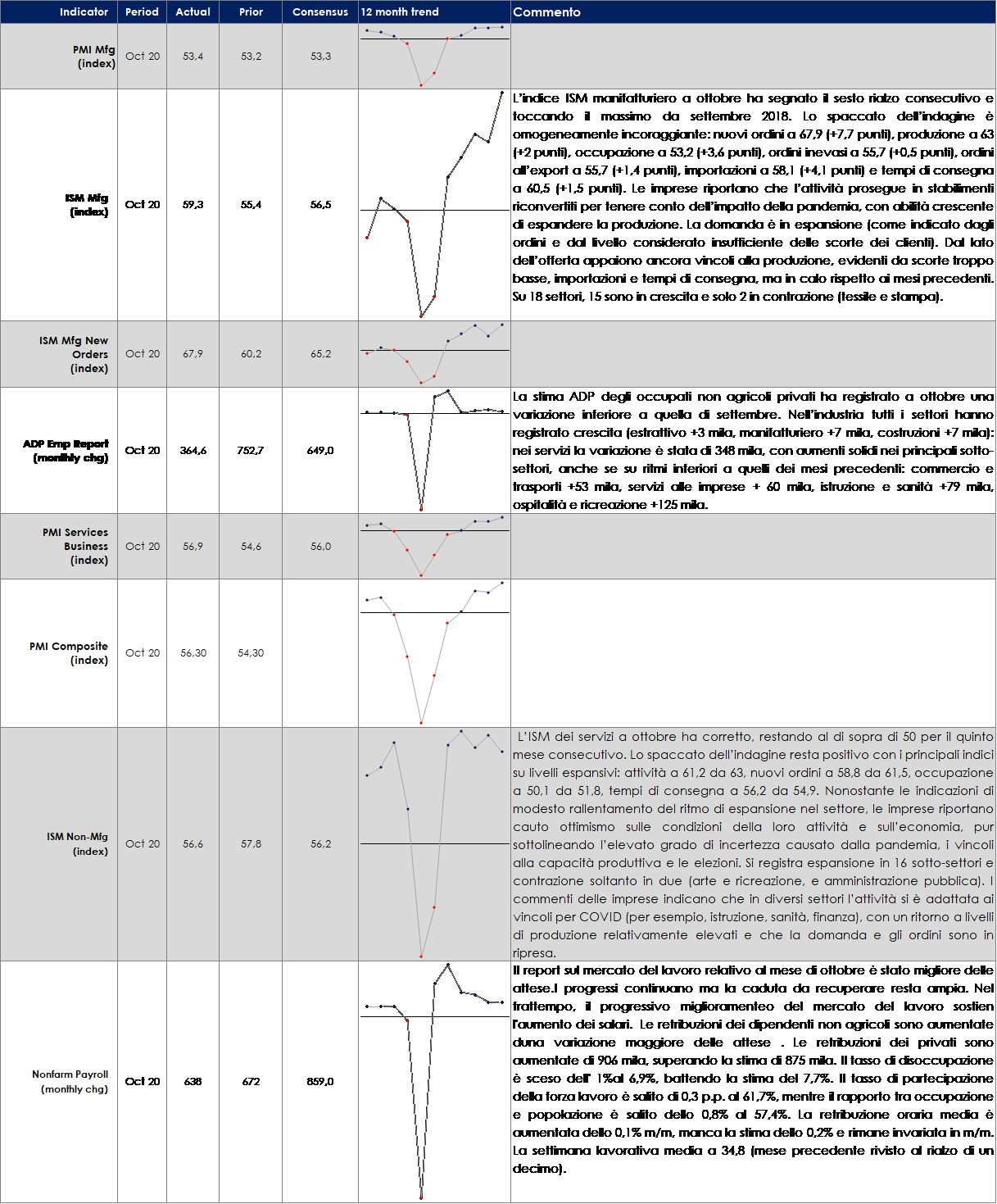 Lo spoglio delle schede elettorali negli Stati Uniti non è ancora terminato e l’esito resta incerto: una vittoria di Biden appare statisticamente più probabile, mentre la Camera dovrebbe verosimilmente restare nelle mani dei Democratici e il Senato in quelle dei Repubblicani (i democratici hanno guadagnato due senatori e ne hanno perso uno). In questo contesto, Trump minaccia una battaglia legale e il ricorso alla Corte Suprema. Una cosa però è chiara, non c’è stata una vittoria schiacciante (“Blue Wave”) per Joe Biden e per i Democratici. Il futuro presidente dovrà prepararsi a gestire un Congresso diviso, che potrebbe fare fatica a trovare un accordo sull’entità e lo scopo dello stimolo fiscale da implementare. Questo rende meno probabile un ampio pacchetto di stimoli fiscali nel breve termine.
