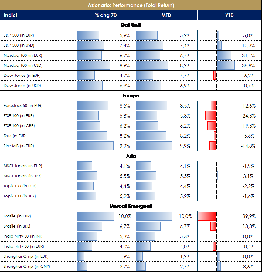 Incertezza elezioni US, ossessione vaccino e sorprendente reporting season. Fino ad ora lo spoglio elettorale è stato accolto favorevolmente dai mercati azionari, che avevano cominciato un rally ancor prima del voto. Ci vorrà tempo e pazienza (tradotto, volatilità) per una view più definita. Lato pandemia, è chiara l’ossessione generalizzata per l’approvazione di un vaccino. Fronte mercati, siamo ormai giunti al termine della sorprendente reporting season del 3Q20 con l’80% delle società che hanno riportato i loro risultati negli USA e il 71% in Europa. In termini assoluti, la crescita degli utili è stata debole con un -7% yoy negli Stati Uniti (-2% yoy non considerando il settore Energy) e un -19% yoy in Europa, considerando le ricadute della crisi covid19 ed il continuo stato di impasse. Il lato positivo di questa reporting è da ricondursi al fatto che i risultati sono stati migliori delle attese del consensus. L’EPS Q320 per l’S&P500 ha avuto in incremento del 15%; negli USA la percentuale di società dell’S&P500 che ha battuto le stime sull’EPS è dell’84%; la crescita dell’EPS per gli USA ha sorpreso positivamente per il 17% rispetto alle stime di consenso. Mentre tutti i settori sono riusciti a fornire forti sorprese positive, solo 6 degli 11 settori dell’S&P500 hanno registrato una crescita positiva degli utili su base annua. In Europa il 70% delle aziende dell’Euro Stoxx 600 ha battuto le stime sull’EPS; la crescita dell’EPS ha sorpreso positivamente del 14%. In Europa, il settore Tech è l’unico che ha registrato una crescita positiva degli EPS, mentre 8 dei restanti settori hanno registrato una crescita negativa double digit. Anche in questo caso, tuttavia, la sorpresa rimane positiva per tutti i settori: in pole quello Auto, con gli OEM che hanno riportato FCF record, deleveraging, investimenti, margini a livelli record e valutazioni fortemente a sconto, e a seguire il “positive sentiment” sul settore Bancario e sulla pronta capital distribution e ritorno al dividendo. In Europa, l’indice Stoxx 600 Auto&Parts ha guadagnato in settimana quasi il 10% (una vittoria di Biden allontana la minaccia di dazi US sulle auto ed esalta il comparto elettrico). Sui mercati azionari, in Europa i settori ciclici sono riusciti a recuperare la sotto-perfomance rispetto a difensivi, con gli indici Stoxx Europe 600 Optimised Cyclicals e Defensive che perdono circa l’8% da inizio anno (vs -11.7% per l’indice Stoxx Europe). Da evidenziare come il Value sia ancora ampiamente a sconto rispetto al Growth (“buy now or never?”). Le valutazioni delle società appartenenti all’indice MSCI Europe Growth sono tornate ai livelli di inizio anno mentre quelle dell’indice MSCI Europe Value hanno perso il 25% ytd. SXXE +7% (top performer Tenaris, CNH e Scor), SX5E +8% (trainato da Amadeus, Axa e Prosus), FTSE MIB +8.30% e FTSE Mid Cap +5.30%. Fronte USA, S&P500 +6% e l’indice S&P500 Information Technology +9.4%. Con un Congresso diviso, infatti, gli investitori hanno visto allontanarsi lo spettro di una maggiore tassazione e regolamentazione per il settore tecnologico. Amazon, Google e Microsoft sono stati tra i top performer (Nasdaq100 +6.40%); in settimana anche l’indice S&P500 Health Care ha guadagnato l’8%. A cura del team Core Equity Value di MB SGRPERFOMANCE MERCATI AZIONARI