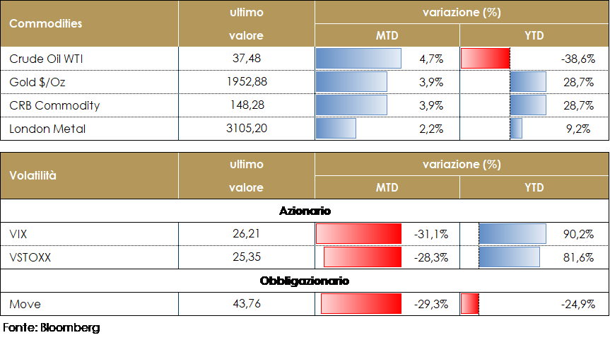 Il prezzo del petrolio è risultato in moderato rialzo nella settimana delle elezioni presidenziali. La ragione di questo movimenti va cercata nello scenario secondo cui un’eventuale vittoria di Biden, che intende regolamentare in maniera diversa il mercato del petrolio domestico, penalizzerebbe parzialmente l’industria del petrolio USA e ridurrebbe l’offerta. Mentre a livello internazionale la scelta del Presidente potrebbe influire anche i rapporti politici con Libia, Iran e Venezuela, con l’ipotesi di un ritorno, massiccio, dell’offerta da questi paesi. Nonostante resti la possibilità di un voto conteso, Il nervosismo degli investitori si è ridotto con l’indice di volatilità VIX sceso a 28 punti, dal picco di 40 di fine ottobre. PERFORMANCE Dati aggiornati alle ore 17.30