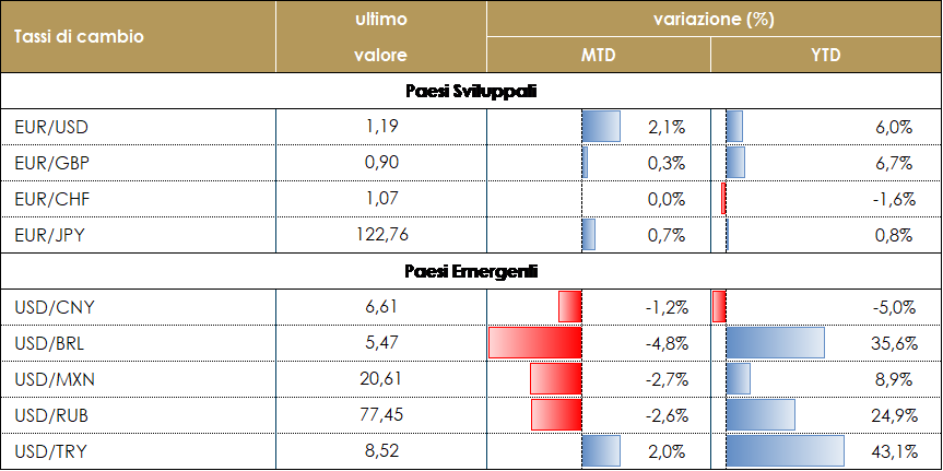 Le elezioni presidenziali americane sono state ovviamente il focus di mercato durante la settimana. L’EUR ha registrato il bottom proprio all’inizio della settimana, poche ore dopo la chiusura delle votazioni negli Stati Uniti. Da quel momento il dollaro ha ripreso a deprezzarsi e chiude la settimana ben al di sopra di 1.18La miglior valuta del G10 è stata la Corona norvegese, che ha guadagnato quasi il 4% durante la settimana; il motivo alla base del risultato è da ricercarsi nel posizionamento di mercato, che ha sottopesato NOK nel corso delle ultime settimane.Nel mondo Emergente, i “low yielders” europei (CZK e PLN) sono stati tra i migliori rispetto a USD, ma in generale l’ultima settimana è stata molto positiva per le valute emergenti. La probabile vittoria di Biden è la ragione di questo risultato: gli investitori si attendono che la nuova amministrazione torni ad avere un approccio cooperativo più che di contrapposizione al commercio globale, permettendo una ripresa della crescita nelle economie emergenti. A cura del team obbligazionario di Mediobanca SGR PERFORMANCE TASSI DI CAMBIO