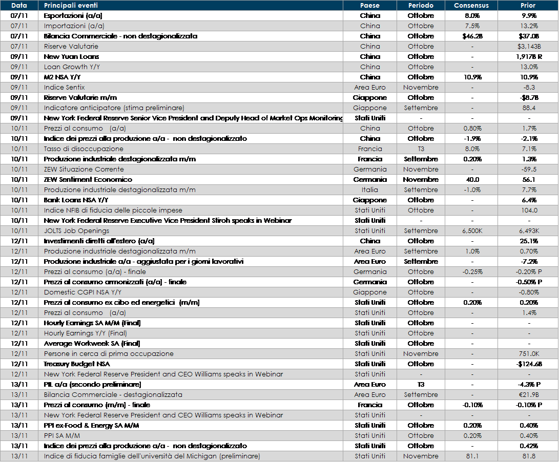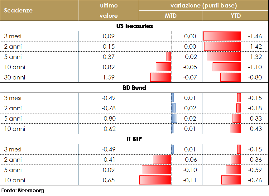 Come anticipato ne “il punto della settimana” il mercato a reddito fisso statunitense è stato il mercato più reattivo all’andamento delle elezioni presidenziali statunitensi. I movimenti che hanno interessato la struttura a termine governativa US si sono riflessi, poi, sui governativi europei. La prima parte della settimana ha fatto registrare sia massimi di rendimento che massimi di pendenza della struttura a termine sulle attese di una “Blue Wave” e di un imminente nuovo piano di stimoli fiscali. Il Treasury decennale ha sfiorato lo 0.9%, mentre ancor più significativo è il movimento dello spread 10-30 anni che ha toccato nuovi massimi dell’anno a 82bps. Tuttavia, l’inaspettata incertezza riguardo l’esito delle elezioni materializzatasi nella notte di martedì e il timore di un gridlock al Congresso ha determinato un movimento di ri-tracciamento particolarmente violento con il differenziale 2-10 anni in calo di ben 10bps, mentre il rendimento del trentennale ha fatto segnare un -20bps. I titoli governativi hanno scarsamente reagito alla riunione del FOMC. È probabile che a breve termine il mercato dovrà affrontare una situazione di incertezza derivante da un voto contestato e questo potrebbe portare a movimenti di flight to quality verso i titoli governativi statunitensi. Nel medio termine conteranno le scelte della nuova amministrazione e torneranno ad essere condizionati dall’evoluzione della pandemia.Oltre Manica, la BoE nella sua riunione di novembre ha aumentato il programma di acquisto di titoli di 150 miliardi di GBP a 875 miliardi, segnalando che potrebbe adottare ulteriori misure di stimolo monetario nei prossimi mesi. Oltre che dalla ripresa dei contagi, la situazione economica è resa più preoccupante dallo stallo che caratterizza ancora i negoziati fra Regno Unito ed Unione Europea. Inoltre, restano dubbi sul livello di preparazione di dogane, logistica e imprese al ripristino delle barriere commerciali che avverrà il 1° gennaio 2021.