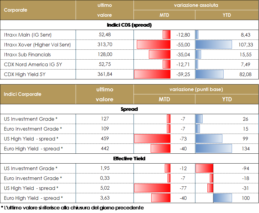 Il mercato dei titoli corporate, dopo tre settimane di allargamento, ha ripreso il trend di movimento di risk-on riportandosi vicino ai minimi di metà settembre con tre sedute molto positive dopo i dati economici in US molto positivi su PMI ad inizio settimana e quelli del mercato del lavoro in chiusura. Sempre dagli States, i mercati hanno accolto positivamente i risultati, peraltro ancora parziali, delle elezioni presidenziali e del rinnovo di buona parte delle camere. Il movimento di risk-on, che ha interessato anche altre asset class rischiose, non ha quindi risentito delle notizie sui lockdown locali che soprattutto in Europa sono stati decretati a seguito dell’aumento dei contagi.Gli spread europei hanno chiuso più stretti rispetto alla scorsa settimana -55bp sul mercato HY (Xover) e -15bp su High Grade (Itraxx Main) e -35bp su Financial Sub con una forza che ha riguardato sia cds che bond cash, in particolare su Hy e subordinati finanziari. Comportamento analogo in US con spread in forte restringimento.Sul mercato primario la settimana è stata sostanzialmente di attesa per cui solo in chiusura sono arrivate sul mercato alcune nuove emissioni tra cui Ferrovial (BBB 500Mio 0.5% 8y) e il convertibile di Cellnex (BB+, 1.5Mio, 11y, 0.75%). Su finanziaria emissione doppia tranche SENIRO di 1Bio per HSBC, 5y 0.31% e 0,77%10y. A cura del team obbligazionario di Mediobanca SGRPERFOMANCE DEI TITOLI CORPORATE