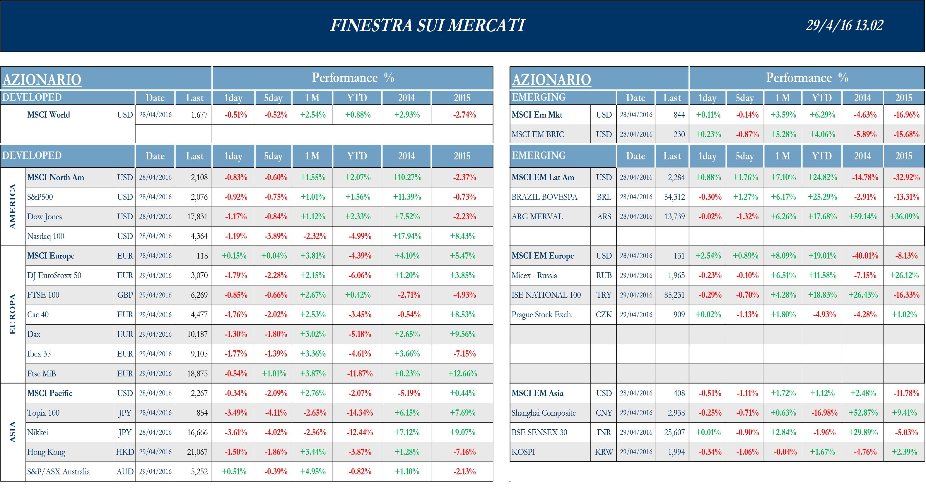 Sul fronte societario italiano, il newsflow è ancora una volta incentrato sul settore finanziario e sul tema banche: il Consiglio dei ministri di oggi pomeriggio è chiamato ad approvare nuove regole sul rimborso degli obbligazionisti colpiti dalla risoluzione di quattro banche, lo scorso, anno e per accelerare il recupero dei crediti bancari, dice una fonte del governo. Il valore di cessione delle quattro banche salvate scende di € 400 mln circa per effetto di nuovi oneri di ristrutturazione necessari a garantire una redditività soddisfacente dei nuovi istituti in vendita. Azimut ha dato vita ad un’operazione call con sottostante azioni della società con un prezzo di esercizio a € 30 per azione e la durata di 4 anni: hanno deciso di partecipare all’operazione 114 aderenti al patto di sindacato su Azimut, tra dirigenti, consulenti e manager di rete, per un importo complessivo di € 4.6 mln; già a inizio settimana, il management si è detto fiducioso di ricevere a breve il nulla osta da Banca d’Italia per la fusione, volta tra le altre cose ad escludere Azimut dall’applicazione della CRDIV. Il via libera di Banca d’Italia è poi arrivato ieri: la scissione con incorporazione di Azimut Consulenza SIM in Azimut Capital Management SGR è il penultimo passaggio della riorganizzazione del gruppo che porterà alla cancellazione dall’albo delle Sim e a rendere pienamente disponibile la cassa. Nelle telecomunicazioni, Telecom Italia ha nominato vice presidente l’AD di Vivendi Arnaud De Puyfontaine. Il gruppo sta, inoltre, realizzando un approfondimento dei conti in seguito all’ingresso del nuovo AD Cattaneo e ha deciso di spostare il Cda per l’approvazione dei risultati dal 5 al 13 maggio. Secondo La Repubblica, la settimana di tempo servirà per definire anche l’acquisto di Metroweb con la contestuale cessione di una quota di Sparkle e discutere della vendita delle torri di Inwit per cui la società starebbe raccogliendo le nuove offerte vincolanti. Guardando all’Europa, sottolineiamo alcune trimestrali degne di nota, in prims guardando alle azione del settore energia. Per il secondo trimestre consecutivo, il colosso inglese British Petroleum pubblica una trimestrale in rosso, con una perdita netta di $ 485 mln, e un calo dell’80% annuo nei ricavi core; la società dichiara che l’obiettivo a breve termine è quello di riequilibrare i flussi di cassa. Nel farmaceutico, migliore del consensus i risultati di Bayer, con utile netto in rialzo del 13% nel Q1, grazie ai farmaci da prescrizione e a quelli per animali. Inoltre, secondo alcune fonti, il colosso svizzero Novartis sarebbe intenzionato a cedere una quota da 13.5 mld di franchi svizzeri di partecipazione nella rivale Roche, di cui è arrivata a possedere il 33% delle azioni in vista di una possibile fusione, mai materializzatasi. Nelle assicurazioni, Swiss Re, secondo riassicuratore mondiale, ha comunicato, per il primo trimestre del 2016, il declino dei profitti netti da $ 1.4 mld a $ 1.2 mld: la società ha dichiarato di aspettarsi per tutto il 2016 difficili condizioni di mercato. Nel bancario, la seconda maggiore banca spagnola, BBVA, ha riportato un calo degli utili netti del 54% rispetto allo stesso periodo dell’anno precedente, causato soprattutto dal minor capital gain e dal deprezzamento delle valute emergenti. Rilevante, infine, la pressione sul titolo Thyssenkrupp dopo la perdita di un’importante commessa in Australia: il governo australiano ha scelto per la costruzione di alcuni sottomarini di prossima generazione dal valore complessivo di $ 40 mld il colosso francese delle navi da difesa Dcns, parte della galassia del gigante Thales, rigettando le offerte provenienti da Germania e Giappone.