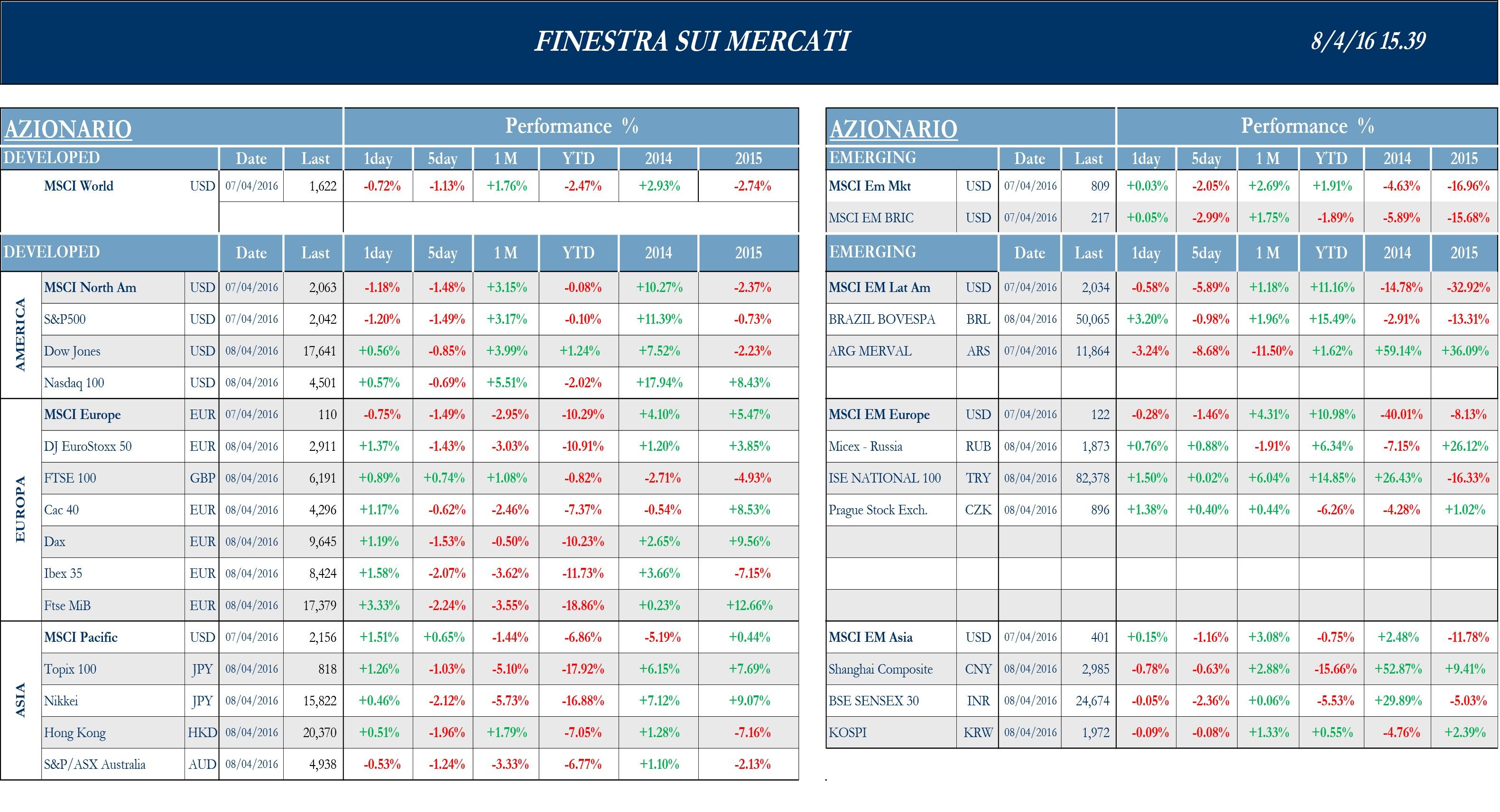 Dal punto di vista macro delle economie asiatiche, molti dubbi rimangono sullo stato di salute dell’economia cinese, che vede una miglioramento del settore dei servizi, ma che allo stesso tempo deve affrontare una contrazione dell’occupazione per la prima volta dall’agosto 2013. L’indice Pmi per i servizi, elaborato da Caixin/Markit, è salito il mese scorso a 52.2 da 51.2 di febbraio mentre il sotto indice sull’occupazione è sceso a 48.9 da 51.3, registrando la prima contrazione dall’agosto 2013. Per quanto riguarda il Giappone, ancora una volta le indicazioni macro sono tutt’altro che positive: ll leading indicator di febbraio mostra un calo di 2 punti dopo la flessione di 0.4 punti del mese precedente e le partite correnti di febbraio mostrano un avanzo di 2,435 miliardi di yen, contro attese per un surplus di 2,006 miliardi. Incerta anche la situazione dell’Australia, dove il settore retail non sembra così solido da poter compensare il rallentamento dell’economia globale e sostenere la crescita di quella nazionale; il mercato è inoltre appesantito dalla decisione del governatore della RBA, Glenn Stevens, di mantenere i tassi invariati per la decima riunione consecutiva di politica monetaria. La Rba ha fatto riferimento a una crescita continuativa malgrado il rialzo della valuta non sia un elemento a favore.