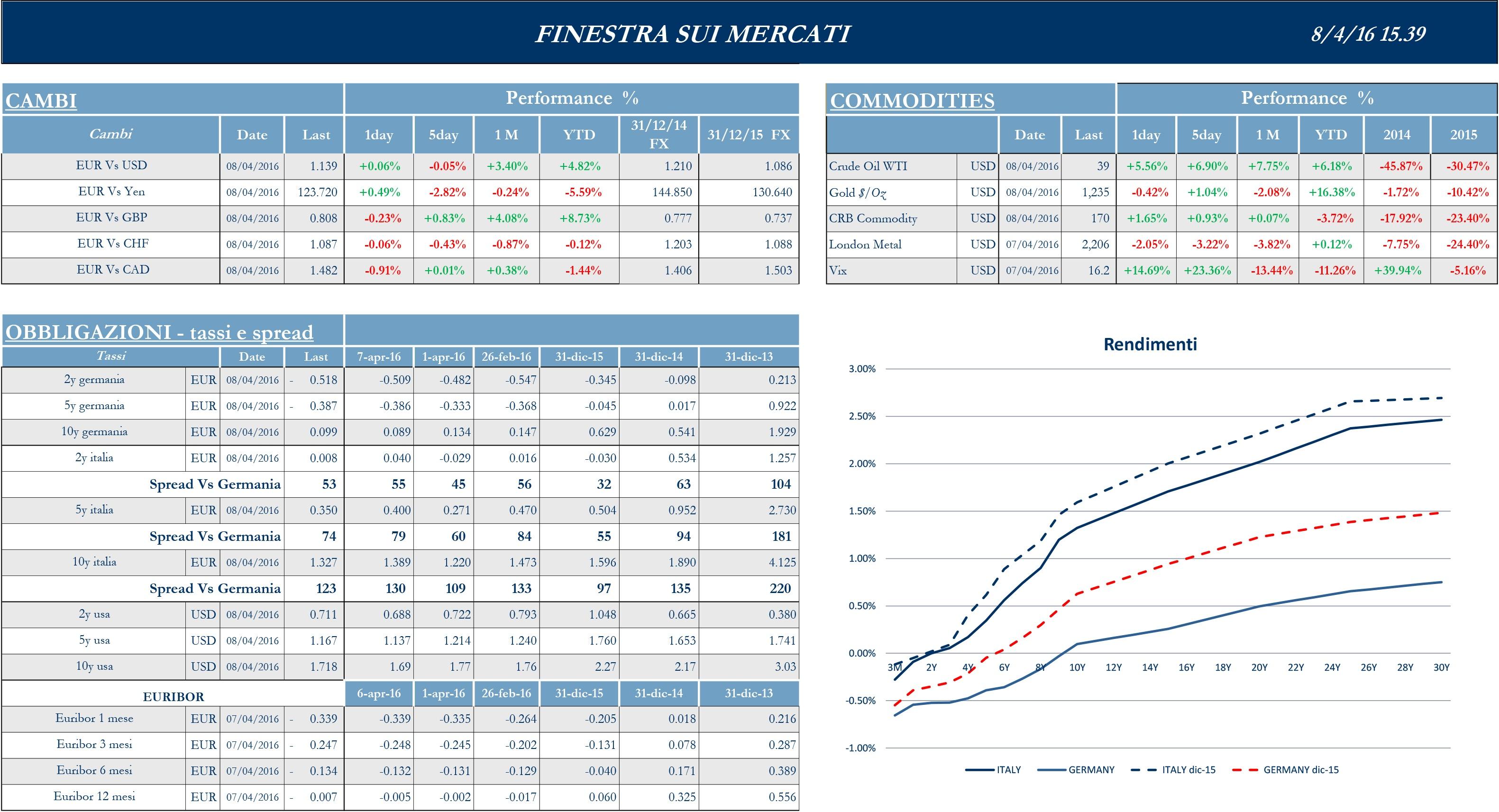 A livello macro per l’Eurozona, la scorsa settimana sono stati pubblicati i numeri relativi alle indagini Pmi finali di marzo, che hanno sostanzialmente confermato quanto emerso dai numeri preliminari: se il settore manifatturiero è visto in lieve crescita, a 51.6 punti dai 51.4 del mese precedente, la decelerazione del settore servizi è netta, a 53.1 punti dai precedenti 54, con il risultato che l’Indice Composto supera di poco i 53 punti. Tra i temi politici, a parte lo scandalo dei “Panama Papers”, torna sotto i riflettori a inizio settimana Atene, alla prese con i colloqui con i creditori sulla prima verifica del rispetto del piano di assistenza finanziaria concesso la scorsa estate, passo necessario per sbloccare la nuova tranche di fondi e avviare un difficile negoziato sull’alleggerimento del debito. Il clima si è fatto più teso dopo le rivelazioni di WikiLeaks, che nel weekend ha pubblicato una trascrizione di una conference call tra funzionari del Fmi, in cui vengono discusse tattiche per esercitare pressione su Grecia, Germania e Ue al fine di chiudere un accordo questo mese. Il ministero delle Finanze tedesco ieri ha ribadito che un haircut del debito non è in discussione e che Berlino si aspetta ancora di arrivare a una conclusione positiva tra la fine di aprile e l’inizio di maggio. In tema rating, lo scorso venerdì a mercati chiusi, S&P ha confermato il rating sovrano spagnolo a ‘BBB+’, con outlook stabile, nonostante la prolungata fase di incertezza politica. Secondo un report di Moody’s, invece, l’economia tedesca dovrebbe registrare una lieve accelerazione nel 2016, con prospettive di bilancio che si mantengono forti.