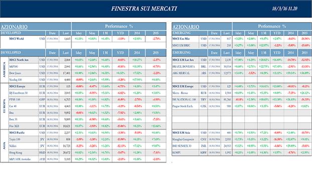 Dopo un ottimo lunedì, i mercati europei vivono una serie di sedute altalenanti durante il resto della settimana. Come nota negativa, in particolare nelle ultime due sedute, le raffiche di vendite sui bancari, specialmente italiani, dopo il newsflow poco incoraggiante sul cosiddetto risiko delle popolari. Nota positiva, sono i rialzi del petrolio, anche in seguito all’atteggiamento dovish della Fed e alla conseguente debolezza del dollaro, unitamente a nuove scommesse di un congelamento dei livelli di produzione. Il contratto Brent torna ai massimi dell’anno, toccando una punta a $ 41.64, mentre i futures sul Nymex segnano il record da inizio dicembre dopo un rialzo di oltre 10% nel corso delle ultime due sedute. Ancora in questi ultimi giorni, dopo il verdetto della Bce dello scorso giovedì, l’attenzione dei mercati è stata focalizzata sulle decisioni di politica monetaria della Banca del Giappone, della Federal Reserve e della Banca d’Inghilterra, che hanno incontrato le attese degli analisti. Nessun istituto, infatti, è intervenuto ritoccando i tassi, ma tutti e tre hanno utilizzato un tono molto accomodante nel rimandare più avanti eventuali decisioni. Se ampiamente atteso era il “nulla di fatto” della Fed, tuttavia, sia la BoJ di Kuroda, dopo la storica decisione sui tassi negativi a fine gennaio, sia la BoE, in attesa del referendum sulla permanenza nell’Ue, non hanno aumentato il “Quantitative Easing”, come parte degli economisti avrebbe atteso. Anche la numero uno del Fmi, Christine Lagarde, ha espresso il proprio appoggio alle politiche monetarie non convenzionali adottate in Europa e in Giappone, se accompagnate da riforme strutturali in un contesto di bassa inflazione. Ancora ieri, Mario Draghi è tornato a ribadire che le misure adottate non sono di per sé sufficienti senza un parallelo impegno da parte dei governi. Sia il presidente sia il consigliere Praet hanno, inoltre, voluto sottolineare che la Bce non ha affatto terminato le munizioni e che i tassi resteranno a lungo tempo sui livelli attuali, se non addirittura più bassi.