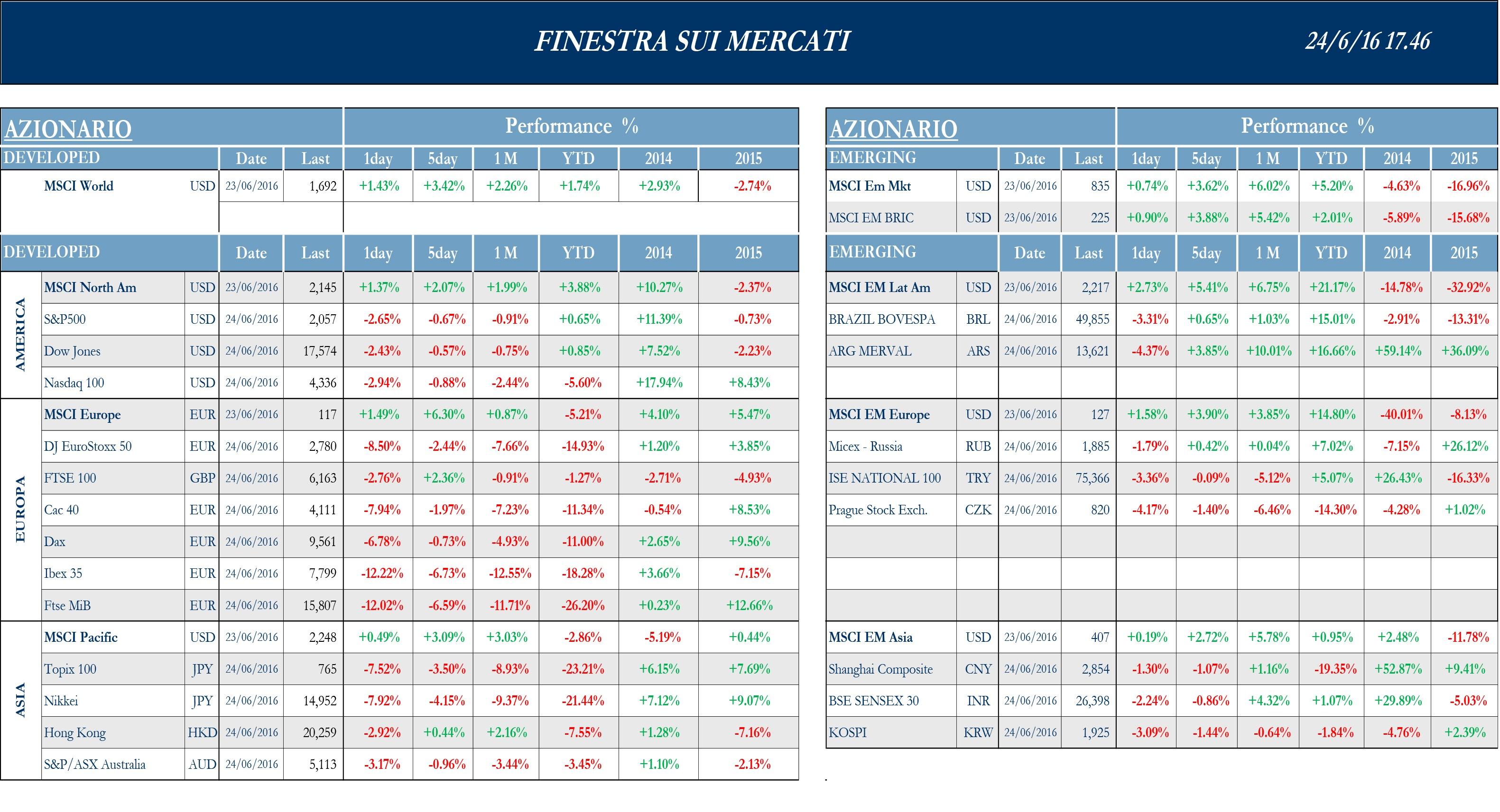 Le speculazioni sulla Brexit restano per tutta la settimana il principale mover dei mercati globali, in un clima di progressivo ottimismo sull’esito del referendum che ha influenzato i cambi, i prezzi delle commodities e sostiene i listini azionari, fino alla smentita rappresentata dall’esito effettivo del voto (uscito stanotte), che ha portato profondamente in rosso le borse asiatiche e ha pesato ovviamente in modo estremo su quelle europee. Il settore più colpitoè quello bancario, dove sono ovviamente più forti le connessioni e l’esposizione al sistema finanziario britannico; la sterlina ha toccato stamattina i minimi degli ultimi trent’anni. Dopo le annunciate dimissioni di Cameron, si resta ora in attesa delle reazioni dei rappresentanti del mondo politico ed economico, oltre che delle elezioni in Spagna. Negli scorsi giorni si sono intanto registrate le parole dei rappresentanti delle banche centrali: la Presidente della Fed si è espressa all’insegna di un’estrema cautela, che permetterà di mantenere il sostegno all’economia e di valutare se il tasso di crescita tornerà moderato, se il mercato del lavoro registrerà ulteriori rafforzamenti e se l’inflazione farà progressi in direzione dell’obiettivo del 2%. La vera novità rispetto alle precedenti dichiarazioni è rappresentata dal “se”. Dai verbali dell’ultimo comitato della BoJ, che non ha apportato modifiche alle misure in essere, emerge poi la preoccupazione di alcuni esponenti rispetto ai rischi al ribasso sull’economia nazionale provenienti dall’estero, che si riflette nel taglio delle stime d’inflazione. Infine, guardando a una Bce che ha più volte ribadito di essere pronta a ogni eventualità in ottica Brexit, il direttivo ha deciso di tornare a accettare i governativi ellenici come collaterale in cambio dell’erogazione di fondi a costo zero, in occasione delle operazioni settimanali di finanziamento. Il prossimo passo dovrebbe essere quello di inserire carta greca nel programma di Quantitative Easing.