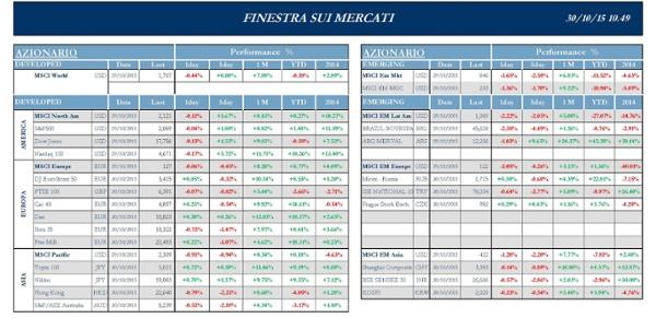 Questa settimana Newsflow societario europeo intenso tra trimestrali e operazioni di M&A. Il fondo LetterOne potrebbe investire fino a $4mld nell’operatore brasiliano di telefonia mobile Oi, se quest’ultimo dovesse aggregarsi con la rivale Tim Brasil. Tim Brasil ritiene che una nuova regolamentazione del settore tlc in Brasile aprirebbe la strada a nuove fusioni. Intanto il magnate francese Xavier Niel ha raggiunto una quota teorica dell’11.2% in Telecom Italia e il mercato si chiede se sia un’operazione a supporto di Vivendi. Eni scivola in rosso nel terzo trimestre e sui nove mesi a causa del persistente ribasso del prezzo del petrolio e l’andamento negativo della controllata Saipem, che sarà deconsolidata essendone stato ceduto il 12.5% al Fondo strategico italiano. Inoltre Saipem lancerà un aumento di capitale da €3.5mld e rifinanzierà €3.2mld di debito residuo. Trimestre solido per Luxottica che si proietta verso una crescita organica dei ricavi ‘mid-to-high single digit’ e un incremento doppio di Ebit e utile. Il CEO Massimo Vian ha detto che il ritmo di crescita degli utili rispetto alle vendite nel 2016 dipenderà dalla velocità degli investimenti programmati per raggiungere l’obiettivo, di lungo termine, di un raddoppio dei ricavi al 2024. FCA ha chiuso l’IPO Ferrari con un ricavato lordo di $982.4mln. Inoltre ha chiuso il terzo trimestre con risultati leggermente migliori delle aspettative e conferma le previsioni per il 2015, ma i dati non adjusted sono significativamente peggiori. Ferrari ha chiuso il trimestre con un EPS di €50cent dagli €30cent di un anno prima. Il CEO Sergio Marchionne ha detto di vedere la distribuzione di azioni Ferrari per spinoff il prossimo 4 gennaio. CNH Industrial ha chiuso il terzo trimestre con un utile operativo delle attività industriali significativamente sotto le attese e ha rivisto al ribasso le previsioni per l’anno. Finmeccanica ha avviato con Hitachi le attività di verifica definitiva in ordine al soddisfacimento delle condizioni contrattuali, per la cessione del 40% di Ansaldo STS prima dell’assemblea in calendario per il 2 novembre. A2A ha sottoscritto un accordo quadro con tutti gli azionisti di Edipower per disciplinare l’uscita dal capitale della società, in virtù della quale diventerà unico socio con il 100%. Infine a partire dal 2 novembre Anima entrerà nel Ftse Mib al posto di Pirelli.