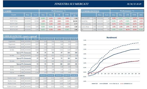 rally dello scorso giovedì innescato dalle dichiarazioni del presidente della BCE Mario Draghi, che lasciavano intendere la possibilità di nuove misure di stimolo monetario a dicembre. Nel corso della settimana si sono espressi altri economisti: da Praet e Constancio sono arrivate dichiarazioni dal tono molto accomodante, che hanno fatto eco al messaggio di Draghi. Il capo economista dell’istituto di Francoforte ha, infatti, ribadito l’intenzione di rivalutare la politica monetaria senza tabù per perseguire l’obiettivo di inflazione. Sulla stessa linea il Vicepresidente BCE, che ha ribadito la volontà di continuare ad ampliare il bilancio dell’istituto finché non si vedrà un sostenuto aggiustamento della traiettoria dell’inflazione. Come sempre, nel consiglio gli orientamenti non sono uniformi: il banchiere centrale estone Hanson e il lettone Rimsevic hanno espresso tutto il loro scetticismo sulla necessità di varare a breve nuove misure espansive. Al contrario, porta incertezza sui mercati la situazione politica portoghese: il presidente della Repubblica ha accettato la composizione del nuovo governo di minoranza, che avrà 10 giorni per presentare il proprio programma al parlamento e arrivare, dopo tre ulteriori giorni di dibattito, al voto di fiducia. L’incertezza politica pesa anche sui titoli di Stato portoghesi, che faticano ad allinearsi al rally post meeting BCE del debito periferico. Nuove notizie anche sul fronte greco: il governo di Atene dovrebbe presentare il piano di ricapitalizzazione dei quattro principali istituti bancari, cui il parlamento dovrebbe concedere via libera domenica.
