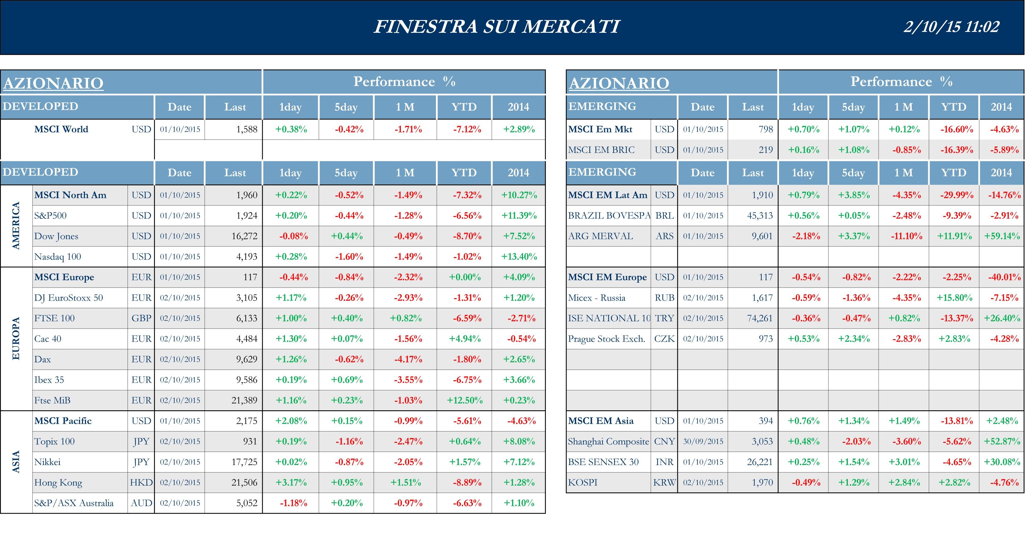 Settimana inizialmente in negativo per i listini europei, che si riprendono poi insieme ai listini statunitensi, mentre inizia la chiusura delle borse cinesi per festività. Il mercato obbligazionario ha mostrato un’intonazione positiva dovuta alle speculazioni su un possibile potenziamento del programma di Quantitative Easing della BCE, alimentate dagli ultimi numeri dell’inflazione. Dal punto di vista della politica internazionale, l’attenzione è stata focalizzata lunedì sul risultato delle elezioni catalane del weekend per il rinnovo del Parlamento regionale: gli elettori si sono espressi ampiamente a favore del movimento indipendentista, con 62 seggi su 135 aggiudicati alla fazione separatista di Junts pel Sì e 10 poltrone agli alleati irredentisti del Puc. Conquistata la maggioranza assoluta, l’intenzione sarebbe quella di dichiarare l’indipendenza da Madrid entro 18 mesi; il governo spagnolo ha, tuttavia, definito incostituzionale qualsiasi pretesa di indipendenza. Sul tema della crescita globale, invece, il direttore del Fondo Monetario Internazionale Christine Lagarde ha preannunciato una revisione al ribasso delle attuali stime del +3.3% per il 2015 e del +3.8% per il 2016, da mettere in relazione alle difficoltà dei paesi emergenti. Per quanto riguarda i pronunciamenti in merito di rating, in linea con le attese di mercato e analisti, Dbrs ha confermato la propria valutazione di A (low) con un trend stabile sul merito di credito dell’emittente sovrano Italia. A motivazione della decisione, l’agenzia fa riferimento ad una posizione di bilancio relativamente solida insieme ai progressi del governo in materia di riforme.