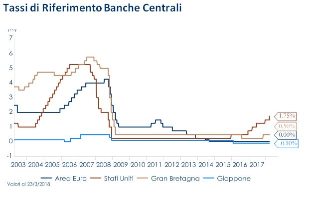 Questa settimana, come ampiamente atteso dai mercati il FOMC ha votato all’unanimità per aumentare l’intervallo obiettivo del tasso sui fed funds di 25 punti base, portandolo all’1,50-1,75%. L’attenzione dei mercati è stata principalmente rivolta al cosiddetto “dots plot (le previsioni dei governatori sul futuro andamento dei tassi ufficiali) e alla proiezioni delle variabili economiche:a) la mediana dei dots ora incorpora tre rialzi dei tassi per il 2018, tre rialzi per il 2019 e due rialzi per il 2020; b) la previsione del tasso di interesse a lungo termine è salita a 2,9% dal precedente 2,8%, sulla scia di aspettative più ottimiste sulla crescita economica e sull’occupazione nel 2018-2019; c) le proiezioni di crescita sono aumentate di due decimi per il 2018 (a +2.7% da +2.5%) e di tre decime per il 2019 (a +2.4% da +2.1%);d) la previsione mediana dell’inflazione è stata rivista al rialzo a 2,1% sia nel 2019 sia nel 2020, riflettendo sia gli effetti di una crescita economica più solida sia una tolleranza al superamento del target di inflazione (2%);e) la previsione del tasso di disoccupazione è stata ridotta di un decimo nel 2018, di tre decimi nel 2019 e di quattro decimi nel 2020. La proiezione mediana del tasso di disoccupazione di lungo periodo (NAIRU) è scesa al 4,5%.Nello statement iniziale il FOMC ha voluto sottolineare che “le prospettive economiche si sono rafforzate negli ultimi mesi”, introducendo un accenno più aggressivo agli effetti trainanti dello stimolo fiscale. Tuttavia, la descrizione dell’attuale congiuntura economica è stata declassata da “solida” a “moderata”, riflettendo probabilmente la moderazione negli indicatori anticipatori della crescita e nelle vendite al dettaglio in T1 2018: il FOMC ha sottolineato che i tassi di crescita della spesa delle famiglie e degli investimenti delle imprese sono risultati “moderati” rispetto ai livelli di T4 2017. In ogni caso, i rischi restano «bilanciati» e la stretta monetaria proseguirà a un ritmo “graduale”.Inoltre, il FOMC ha definito per la prima volta l’obiettivo di inflazione per la Fed come “simmetrico”, lasciando intendere che la Fed è disposta a tollerare un aumento dell’inflazione sopra il 2%. Tuttavia, durante la conferenza stampa il governatore Powell non ha fornito un riferimento numerico sul valore massimo (sopra il 2%)che la Fed è disposta a tollerare.I mercati hanno recepito il messaggio come particolarmente cauto: da un lato, alcuni operatori si aspettavano che la mediana delle previsioni indicasse quattro rialzi dei tassi, dall’altro, Powell non ha chiarito il futuro della politica monetaria sia in termini dei prossimi rialzi sia del livello di inflazione tollerato sopra il 2%. Durante la conferenza stampa ha suggerito più volte agli operatori di mercato di non dare troppa attenzione ai dots, che a suo avviso non sono altro che le previsioni personali dei singoli membri del FOMC sui futuri tassi di interesse e, pertanto, non vincolanti per le future scelte della Fed. Quindi, secondo il Governatore, l’unica decisione presa collegialmente dal FOMC di marzo è stata quella relativa l’attuale rialzo dell’intervallo obiettivo per il tasso sui fondi federali di 25 punti base. Contestualmente, dall’altro lato dell’Atlantico, la BoE ha lasciato invariato i tassi di interesse allo 0.5% nella riunione di questa settimana, preparandosi ad alzare i tassi di riferimento a maggio. Infatti, da un lato, l’accordo sul periodo di transizione (fino a fine 2020) successivo a quando il Regno Unito avrà lasciato formalmente l’UE riduce il rischio di una recessione legata alla Brexit, dall’altro, le notizie sul fronte salariale sono più confortanti (crescita media dei salari pari a 2,8% a gennaio). Anche la BCE continuerà ad essere molto cauta nella propria strategia di uscita: gli indicatori anticipatori pubblicati in settimana mostrano un significativo rallentamento della crescita rispetto all’ultimo trimestre del 2017, a fronte di un’inflazione che rimarrà ben al di sotto dell’obiettivo del 2% per tutto il 2018. Infatti, il calo della componente relativa all’indice dei prezzi alla produzione del PMI di marzo ha indicato che la ripresa in atto non sta generando pressioni inflazionistiche. In Giappone, l’inasprimento della politica monetaria non è nemmeno all’orizzonte. Durante l’ultima riunione di politica monetaria, la BoJ ha nuovamente lasciato invariato il tasso di sconto e gli obiettivi di rendimento decennali, rispettivamente allo 0,1% e allo 0%, e si è impegnata a continuare ad acquistare attività a un ritmo annuale di circa ¥ 80 trilioni. Anche la riconferma del governatore Kuroda, per un secondo mandato di cinque anni, è un forte segnale che la politica rimarrà molto accomodante.