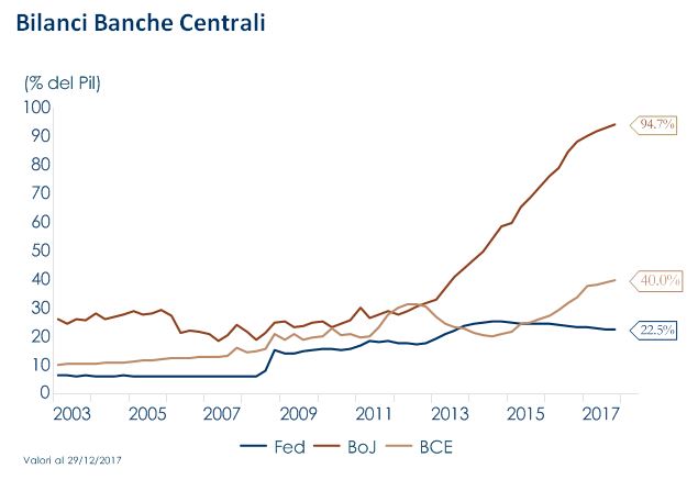 Ci aspettiamo una maggior pressione al rialzo sui tassi di interesse globali. Da un lato la Fed continuerà con una stretta monetaria graduale, dall’altro il QE su scala globale dovrebbe toccare i livelli massimi durante il 2018: gli acquisti di titoli da parte della BoJ e della BCE compenseranno in parte la stretta monetaria della Fed e continueranno a pesare sul term premium globale. Queste dinamiche dovrebbero limitare, ma non escludere, l’ascesa dei tassi di interesse a lungo termine. Inoltre negli Stati Uniti la riforma fiscale in approvazione aumenterà il deficit US, causando un aumento del segmento a lungo termine della struttura a termine.