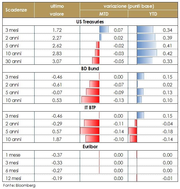 Le struttura a termine dei titoli governativi dei principali paesi si sono leggermente appiattite sulla scia del peggioramento della retorica sul commercio internazionale e il conseguite aumento dell’avversione al rischio. I rendimenti del Treasury statunitensi sono rimasti pressoché invariati lungo la curva. Di fatto i mercati obbligazionari hanno interpretato la riunione del FOMC in modo più accomodante di quanto atteso, essendo stati per ora confermati solo tre rialzi dei tassi nel 2018. I rendimenti dei titoli governativi hanno registrato un movimento più significativo dall’altra sponda dell’Atlantico. In Gran Bretagna, il segmento a breve termine ha registrato un brusco aumento iniziando a prezzare quasi completamento un aumento dei tassi di interesse a marzo (il mercato prezza attualmente una probabilità pari al 72.7% per un rialzo a maggio), dopo un meeting di politica monetaria avvertito come particolarmente aggressivo. Nell’Area Euro il rallentamento degli indici anticipatori ha pesato sul rendimento dei Bund.