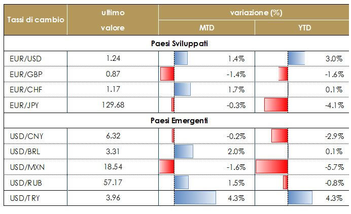 Riteniamo che l’evoluzione della politica fiscale negli Stati Uniti e la rimodulazione delle attese future da parte della Fed guideranno il tasso euro-dollaro fino alla fine dell’anno.