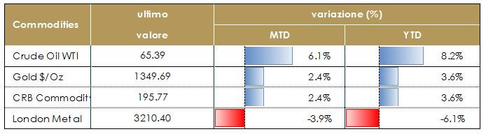 Il prezzo del petrolio sale sopra i 65 dollari al barile dopo la flessione a sorpresa delle scorte API statunitensi e sui persistenti timori circa la volatilità delle forniture mediorientali. Il calo sorprendentemente alto delle riserve è la conseguenza del periodo di manutenzione delle raffinerie, che però volgerà al termine proprio questo mese, eliminando questo fattore di spinta stagionale. In aumento il prezzo dell’oro sulla scia dell’aumento dell’avversione al rischio dei mercati.