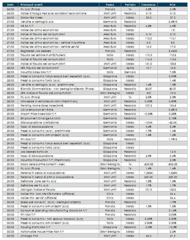 • Europa: per l’intera Area Euro sono in arrivo i dati sulla fiducia dei consumatori. Fiducia manifatturiera e dei consumatori in Italia e in Germania, insieme ai numeri preliminari dell’inflazione di marzo. PIL e CPI in Francia.