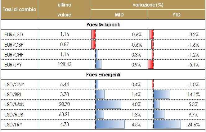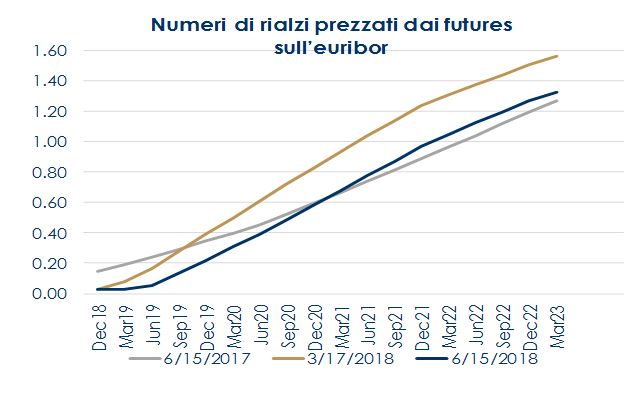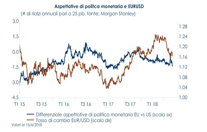 Come atteso, nel meeting di questa settimana il FOMC ha aumentato l’intervallo obiettivo per il tasso sui fondi federali di 25 pb, portandolo a 1,75-2,00%, in un meeting che, sulla scia del rafforzamento della fiducia della Fed sulla solidità della congiuntura US, ha comunque riservato alcuni elementi più hakwish delle attese. La mediana del cosiddetto “dot plots” per il 2018 incorpora ora 4 aumenti (il voto di un membro del FOMC si è spostato più in alto) e 3 nel 2019, il che significa che è stato aggiunto un ulteriore aumento del costo del denaro tra oggi e fine 2018. Infatti, a marzo il FOMC era diviso tra tre e quattro rialzi in totale per quest’anno. Inoltre, la Fed ha aggiornato le sue stime dei principali parametri economici del paese. Il PIL per il 2018 è atteso in crescita al 2.8% contro il 2.7% di marzo; l’inflazione è prevista al 2.1% (a marzo era l’1.9%) ed il dato coredovrebbe attestarsi al 2%, rispetto all’1.9% di marzo. Il tasso di disoccupazione è previsto al 3.6% per quest’anno, rispetto alle stime del 3.8% dello scorso trimestre. Dall’altra sponda dell’Atlantico, la BCE ha annunciato che gli acquisti netti di titoli termineranno a dicembre 2018 e che “dopo settembre 2018, il ritmo mensile sarà ridotto a 15 miliardi”, in un meeting che si è dimostrato più dovish delle attese. L’annuncio della fine del Quantitative Easing è stato mitigato, da un lato, da una modifica della forward guidance, che ora prevede che il corridoio dei tassi di interesse (tasso di deposito a -0,4%, tasso di repo allo 0,0) invariato ai livelli attuali fino all’estate 2019 e, dall’altro, dall’affermazione che il programma di acquisti di titoli privati e pubblici intrapreso nel 2015 non è da considerarsi eccezionale, ma parte integrante della cassetta degli attrezzi della politica monetaria. In questo modo, la BCE sta cercando di calmierare le attese sui rialzi dei tassi e controllare il term premium sulla struttura a termine dei titoli governativi. Prima del meeting, le aspettative erano divise su quando la BCE avrebbe ri-definito i dettagli del suo piano degli acquisti (se questa settimana o nella riunione di luglio), a causa della maggiore cautela richiesta dalla situazione politica italiana e dalla recente debolezza dei dati economici. Il Presidente Draghi ha comunque spiegato che il sostegno della politica monetaria continuerà a essere fornito dal consistente stock di titoli detenuti nel bilancio della BCE e dal reinvestimento per un periodo “prolungato e necessario” del capitale dei titoli rimborsati e giunti a scadenza (attività di reinvestimento iniziata in marzo 2017). Attualmente, le modalità di re-investimento del capitale non sono ancora note: il presidente Draghi ha ribadito nel meeting che una decisione a riguardo sarà importante e verrà presa nei prossimi mesi. Contestualmente, la BCE ha pubblicato le nuove previsioni di crescita ed inflazione. La crescita è stata rivista al ribasso dal 2,4% al 2,1%, ma le previsioni per il 2018 e il 2019 sono state mantenute rispettivamente all’1,9% e all’1,7%. Le previsioni di inflazione per quest’anno e il prossimo sono state rivedute a causa dell’aumento dei prezzi del petrolio, mentre le previsioni per il 2020 sono rimaste invariate all’1,7%. La BCE non è sembrata preoccupata del rallentamento della congiuntura economica, sostenendo che la crescita dell’intera Area resta solida anche se in T2 il rallentamento potrà caratterizzare ancora alcuni paesi. D’altra parte, Draghi ha anche sottolineato come le turbolenze italiane legate alla formazione del nuovo governo possono essere considerate un “episodio locale” all’interno di un progetto europeo, che resta forte ed irreversibile. In risposta alla riunione di politica monetaria di questa settimana, il mercato ha ulteriormente rimodulato le proprie aspettative di politica monetaria ed ora si attende il primo rialzo del costo del denaro in autunno del 2019. Conseguentemente, l’euro si è deprezzato rispetto al dollaro US. Questo movimento ci ricorda che i tassi di cambio sono fortemente influenzati dalla rimodulazione delle attese di politica monetaria che dovrebbe muoversi nel medio lungo periodo coerentemente con i fondamentali economici. Dopo tutto, l’apprezzamento dell’euro l’anno scorso è stato proprio guidato dall’accelerazione dell’attività economica nell’Area Euro nella seconda parte dell’anno.
