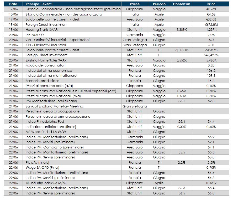 - Stati Uniti: settimana ricca di dati macroeconomici ad iniziare dai valori preliminari degli indici Markit PMI di giugno e dai dati sul mercato immobiliare con nuove costruzioni abitative, permessi edilizi e vendite di case esistenti di maggio.