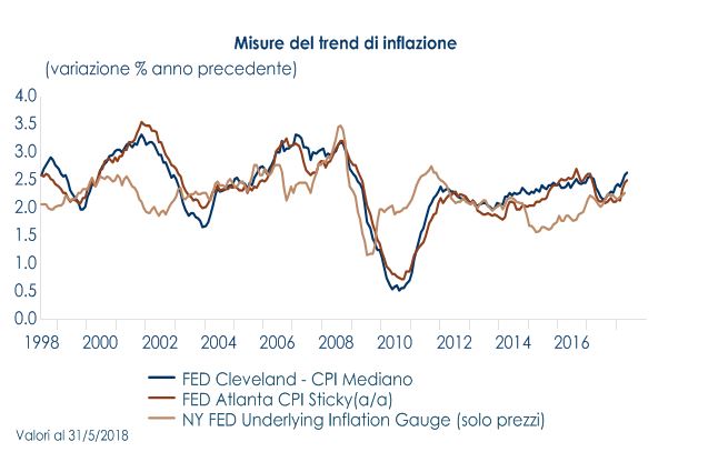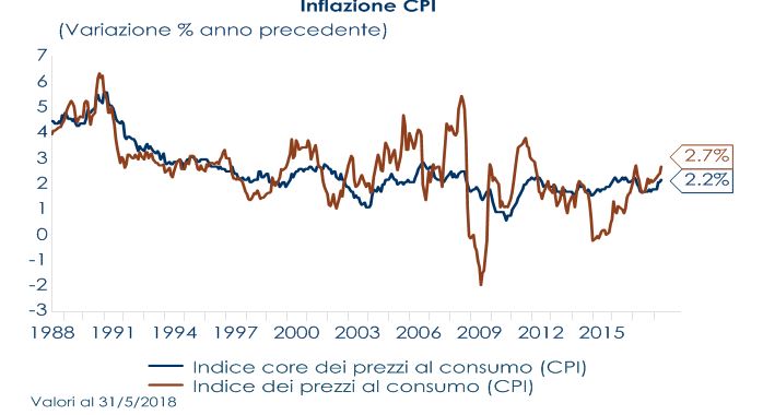 A giugno l’indice ZEW tedesco ha mostrato un marcato rallentamento in entrambe le sue componenti, situazione corrente ed aspettative: l’indice delle aspettative è sceso a -16,1 (atteso -14) da -8,2, mentre quello sulla situazione corrente è peggiorato a 80,6 (atteso 85) da 87,4. L’indice incorpora probabilmente gran parte dell’incertezza legata alla formazione del governo italiano. Debole anche la produzione industriale dell’Area Euro nel mese di aprile, che è scesa dello 0,9% m/m (consenso -0,7% m/m), sulla scia della contrazione registrata in Germania, Francia, Italia e Spagna. Questo dato è il primo di T2 e indica che è probabile che non vedremo una ripresa della produzione industriale in T2, dopo l’andamento deludente di T1 (-0,6% t/t). La stima tendenziale si porta così a 1.7% a/a (consenso: 2.8% a/a, valore precedente: 3% a/a). Il ritmo espansivo del comparto industriale si sta chiaramente ridimensionando nel 2018 rispetto al 2017. Anche l’Italia ha presentato una produzione industriale pari a +1.9% a/a, inferiore alle previsioni (+3.6% a/a). L’altra indicazione di maggior rilievo riguarda l’inflazione di maggio. Francia e Germania confermano i numeri delle letture preliminari; in particolare, l’inflazione tedesca si attesta al +0.5% m/m e +2.2% a/a. Il dato aggregato rivela prezzi al consumo in crescita dello 0.5% m/m e dell’1.9% a/a, in linea con le letture preliminari di maggio. In UK, i dati sull’occupazione sono stati ambivalenti ad aprile. La disoccupazione si è attestata al 4,2% a/a (consenso: 4,2%, valore precedente: 4,2%), mentre la crescita dei salari è stata moderata, con guadagni settimanali medi esclusi bonus al 2,8% (consenso: 2,9%; valore precedente 2,9%). Compresi i bonus, i guadagni sono risultati in linea con le attese del 2,5% e invariati rispetto alla lettura precedente.