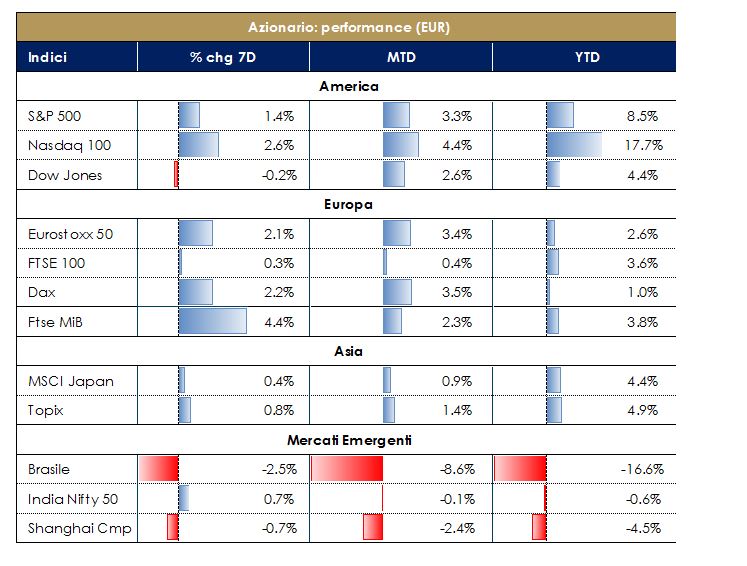 Durante la settimana l’attenzione dei mercati si è rivolta verso l’inflazione di maggio. L’indice dei prezzi alla produzione è salito dello 0,5% m/m (consenso: 0,3% m/m, valore precedente: 0,1% m/m), portando il dato tendenziale a 3,1% a/a (consenso + 2,9% a/a, valore precedente 2,6% a/a). L’aumento è stato guidato dalla componente energetica, in aumento del 4,6% m/m, e si è avvantaggiato del contributo positivo dei servizi commerciali, dei trasporti e delle scorte. L’indice PPI core è aumentato dello 0,3% m/m, portando la crescita annualizzata al 2,4% a/a. Lato consumi, l’inflazione di maggio si mostra in linea con le attese, al +0.2% m/m e +2.7% a/a. L’inflazione core è salita a 0,2% m/m (rispetto allo 0,1% del mese precedente), portando il tendenziale a 2.2% a/a. A giugno l’indice di produzione Empire ha riportato un marcato miglioramento toccando 25.0 (consenso: 18.5, valore precedente: 20.1). I nuovi ordini, le spedizioni e gli indicatori di occupazione sono risultati migliori delle attese. Circa il 38% degli intervistati ha riferito un miglioramento delle condizioni lavorative per il mese di giugno, mentre solo il 13% ha riferito un peggioramento. L’ottimismo sull’Outlook di sei mesi è aumentato per il secondo sondaggio consecutivo.