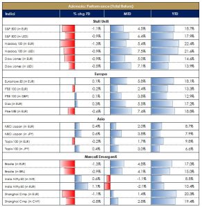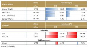 L’ultima settimana conferma il trend al rialzo nel prezzo delle materie prime, in particolare del petrolio (+5%); nel corso del mese di giugno il greggio è risalito del 10%, l’oro dell’8% (sui massimi dal 2013) e le materie prime agricole del 2%. Se da un lato il fattor comune è stato l’indebolimento del dollaro, sul settore energetico pesano le recenti tensioni USA-Iran, ad un passo da una escalation militare negli scorsi giorni. In settimana il rialzo è avvenuto in corrispondenza del forte calo delle scorte EIA (Energy Information Administration) di petrolio e benzina, sulla scia di un consumo in aumento negli USA. La volatilità implicita sui principali listini azionari rimane su livelli storicamente contenuti. |
