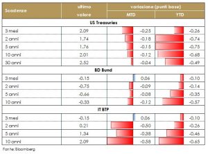 I rendimenti governativi dei principali paesi sviluppati sono rimasti range bound in attesa dell’esito del G20 e della pubblicazione dei dati US della prossima settimana. Il mercato sconta ormai pienamente un taglio di 25 pb a luglio e settembre, un accordo credibile tra USA e Cina potrà ridurre questa probabilità, ma solo un significativo miglioramento dei dati macroeconomici potrebbe portare la Fed a non tagliare in luglio. Infatti, lo stesso Powell nel corso della conferenza post FOMC ha tuttavia dichiarato al riguardo che “impareremo molto” dai dati in uscita. Sull’altra sponda del pacifico la politica monetaria resta accomodante. In settimana sono stati pubblicati i verbali dell’ultima riunione politica della BoJ, che hanno mostrato che il “forward guidance tweak” (l’aggiunta di bassi tassi per rimanere “almeno fino alla primavera 2020”) è stato il risultato di discussioni sulla necessità di un ulteriore allentamento monetario. Un segnale che rafforza le attese per un possibile intervento della BoJ già il mese prossimo. La BoJ ha spiegato che considererà quali fattori a guida della propria politica monetaria: la ripresa delle d’oltremare e il ciclo globale di beni tecnologici e l’impatto del previsto aumento dell’imposta sui consumi. In occasione della riunione trimestrale del comitato di politica monetaria del PBOC la PoBC ha ribadito il suo bais per una politica monetaria fortemente accomodante a sostegno dell’economia, poiché il livello di incertezza esterna è significativamente aumentato.