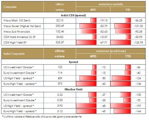 | Sul mercato primario, la settimana è stata ancora molto intensa con diverse nuove emissioni anche multitranche, in particolare Medtronic, produttore di medical equipment con un deal di sei emissioni, Floater, fissa 3.5y, 6y, 12y, 20y e 30y (750Mio per le prime due, 1Bio sulle 4 emissioni fisse con pricing rispettivamente 0%, 0.25%, 1%, 1.5%, 1.75%. Altre due multitranche per Omnicom (Media, BBB+, 500Mio, 8y e 12y 0.8% e 1.4%) e OMV (Energy A-, 500Mio, 6y e 15y 0% e 1%). Sempre per emittenti non finanziari emissione Hybrid per Engie (500Mio Jr Subordinated Perp NC6 1.625%), mentre senior per Sncf (1.5Bio Senr 16y 0.75%), Hera (BBB 500Mio Senr 8y 0.875%), Motability (600Mio Senr 6y 0.375%), Unibail (A 500Mio Senr 29y 1.75%), Cnh (BBB 500Mio Senr 10y 1.625%), Prologis (A- 450Mio Senr 10y 0.875%), Umg (500Mio Senr 10y 1.625%), Enexis (500Mio Senr 12y 0.75%), Klepierre (A- 600Mio Senr 10y 0.625%) e Telefonica (BBB 500Mio Senr 19y 1.957%). Su financial emissione subordinata LT2 per Bnp Paribas (BBB+ 1000Mio Subordinated 12y 1.625%) e covered per Mediobanca (750Mio Secured 7y 0.5%). Dal lato emissioni senior, non preferred per Nykerdit (BBB+ 500Mio 5y 0.625%), Bankinter (750Mio 7y 0.875%) e Unicredit (BBB- 750Mio 6y 1.625%) mentre senior preferred per Intesa (1250Mio 5y 1% e 1Bio 10y 1.75%), Skandinaviska Enskilda (A+ 1Bio 4y 0.05%), Standard Chartered (BBB+ 500Mio 8y 0.9%), SocGen (BBB+ 750Mio 6y 0.875%) [A cura del team obbligazionario di Mediobanca SGR]. | |