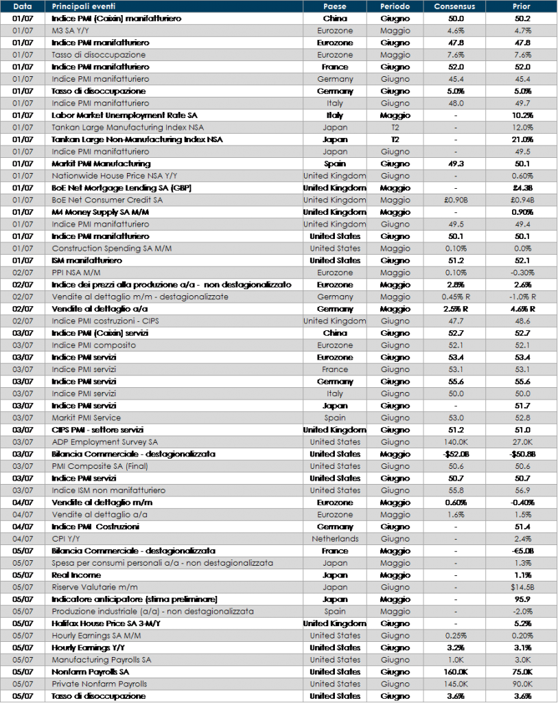 - Asia: In Giappone saranno pubblicate la settimana che viene indicazioni sulla fiducia delle imprese misurata dagli indici Tankan del secondo trimestre. In Cina sarà la volta degli indici PMI Caixin di giugno.