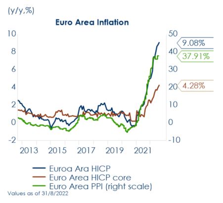 La decisione di questo mese a favore di un passo più ampio (75 pb anziché 50 pb), frutto di un’ampia discussione all’interno del Consiglio Direttivo, segnala ai mercati l’urgenza e la determinazione della BCE a riconquistare credibilità nella lotta all’inflazione e che è disposta ad accettare costi in termini di crescita più bassa per garantire la stabilità dei prezzi. Inoltre, settembre è stato forse il momento migliore per la BCE per inviare questo segnale, dato il rallentamento della crescita economica atteso in futuro. A far pendere l’ago della bilancia sono state probabilmente le preoccupazioni per il de-ancoraggio delle aspettative di inflazione, con pochi segnali di rallentamento dell’inflazione nel breve termine.