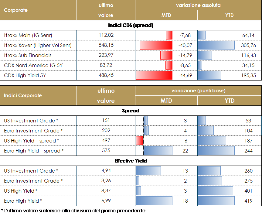 Nell’ultima settimana il mercato corporate ha avuto una performance sostanzialmente positiva in termini di spread, performance bilanciata nel total return dall’andamento dei tassi core, che hanno continuato la risalita nel periodo.L’attenzione dei mercati nella settimana è stata concentrata sulla riunione della BCE, che giovedì ha alzato, come da attese, i tassi di 75bp e confermato la necessaria e prolungata fase restrittiva. I flussi sull’asset class e in particolare l’attività sul mercato, primario e secondario, sono tornati sui livelli tipici del periodo con un buon interesse degli operatori dopo una fase in cui l’incertezza ne aveva limitato l’operatività e determinato la price action.Su base settimanale, inclusa la giornata odierna, gli Indici CDS hanno chiuso con un -40bp in Europa su Itraxx Xover (Hy) e -60 su CDX HY in US mentre su IG -7 su Itraxx Main (eur) e -10 su CDX IG.Sugli indici cash il total return è stato positivo su High Yield con una sovraperformance in US, +2% vs +1% in europa con una accelerazione nelle ultime due sedute. Su High Grade la contrazione degli spread ha permesso in US di chiudere positivi (+0.5%) nonostante il movimento al rialzo delle curve dei tassi mentre in europa la performance è stata lievemente negativa con un recupero nell’ultima seduta.Sul mercato primario segnaliamo i nuovi deal nel comparto finanziario, il double tranche senior di La Poste (A+ 600Mio 6y 2.625%, 600Mio 11y 3.125%), il Senior Non preferred di Banco BPM (BB+ 500Mio 4y 6%), senior preferred di OP Corporate Bank (AA- 1.25Bio 3.25y 2.875%) e di Credit Mutuel Arkea (AA- 1Bio 5y 3.375%) e Su Corporate segnaliamo Enel (BBB+ 1Bio 5.5y 3.875%), Ferrovie (BBB, 1.1Bio 4.5y 3.75%), Air Liquide (AA- 600Mio 10y 2.875%), John Deere (A 600Mio 4y 2. 5%) e SKF (BBB+ 400Mio 6y 3.125%). A cura del team obbligazionario di Mediobanca SGR