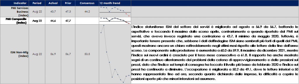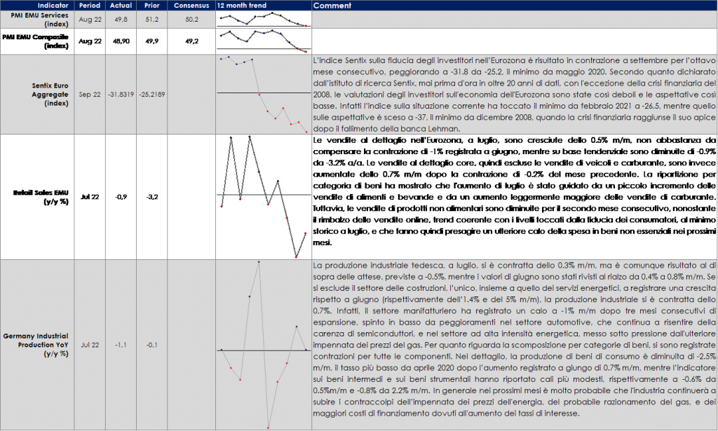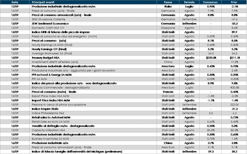 - Europa: La prossima settimana, saranno pubblicati i dati aggregati sulla produzione industriale dell’Area euro, che potrebbero mostrar un calo della produzione a luglio, segnando un inizio debole del terzo trimestre per il settore. Inoltrei saranno pubblicati i dati sul costo orario del lavoro per T2 e la seconda stima dei dati sull’inflazione ad agosto. Mercoledì il Presidente della Commissione Europea Ursula von der Leyen terrà il suo discorso sullo stato dell’Unione, che potrebbe includere ulteriori dettagli sulle misure energetiche.