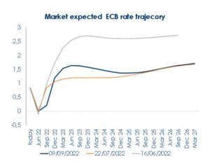 - Il presidente Lagarde ha comunicato nel suo intervento un senso di urgenza di arrivare al tasso neutrale anche alla luce del rischio che l’Area Euro scivoli in recessione a fine anno