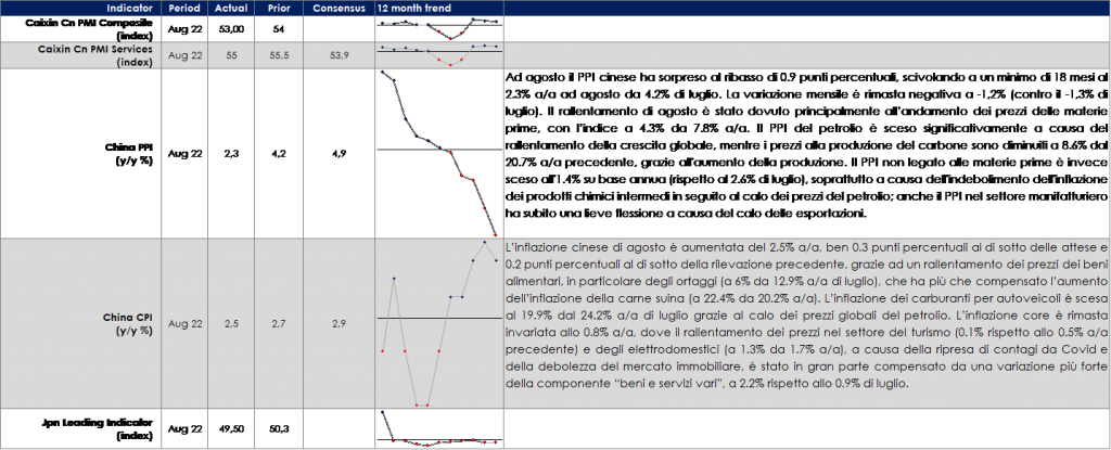 Dopo Jackson Hole, questa settimana l’attenzione dei mercati è stata catalizzata dalla riunione di politica monetaria della BCE, che ha trasmesso un messaggio complessivamente hawkish di una banca centrale che sta cercando deliberatamente di “smorzare la domanda” aggregata per frenare l’inflazione. La riunione di politica monetaria ha determinato un significativo repricing sul mercato obbligazionario, con il decennale tedesco che solo nella giornata di ieri è salito di 14pb ed oggi quota sotto 1.70%. Ben maggiore l’impatto sulla parte a breve, con un violento movimento di bear flattening che ha ridotto il differenziale 2/10y di circa 10pb. La riunione ha prodotto anche una rimodulazione delle aspettative sui prossimi rialzi del costo del denaro: oggi secondo aspettative degli investitori, il tasso di deposito dovrebbe raggiungere quasi il 2,5%, rispetto al 2¼% precedentemente prezzato. Negli Stati Uniti J. Powell, in un Q&A tenutosi presso il Cato Institute, ha ribadito i messaggi chiave di Jackson Hole, suggerendo che è ampiamente soddisfatto della risposta del mercato e della rivalutazione del percorso del tasso dei fed funds iniziata nelle settimane successive alla riunione del FOMC di luglio. I rendimenti governativi lungo la struttura a termine hanno continuato a salire guidati dalla componente reale e dal term premium. La settimana prossima sarà pubblicato il dato sull’inflazione statunitense relative al mese di agosto e il dato sulle vendite al dettaglio. I dati saranno importati per discriminare tra un aumento di 75pb e 50 pb nella riunione del 21 settembre. Il mercato dei fed fund rate attribuisce oggi una probabilità dell’80% ad un aumento di 75.pb. La settimana prossima sarà la volta della BoE. L’annuncio, avvenuto questa settimana, da parte del nuovo governo di un tetto massimo per i prezzi dell’energia elimina il senso di urgenza che il MPC aveva quando prospettava un altro significativo aumento dell’inflazione (ricordiamo che prevedeva l’inflazione al 13% per la fine del 2022). L’inflazione ha probabilmente raggiunto il suo picco, per questo il mercato abbia ridotto la probabilità implicita (condizionata) di un rialzo di 75 punti base dall’84% circa al 58% circa. Tuttavia, la probabilità di raggiungere il prezzo di mercato dei tassi di base terminali al 4,25-4,50% è aumentata data la natura prociclica dei piani fiscali del Regno Unito.