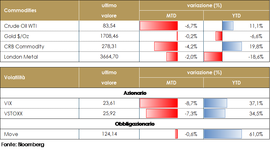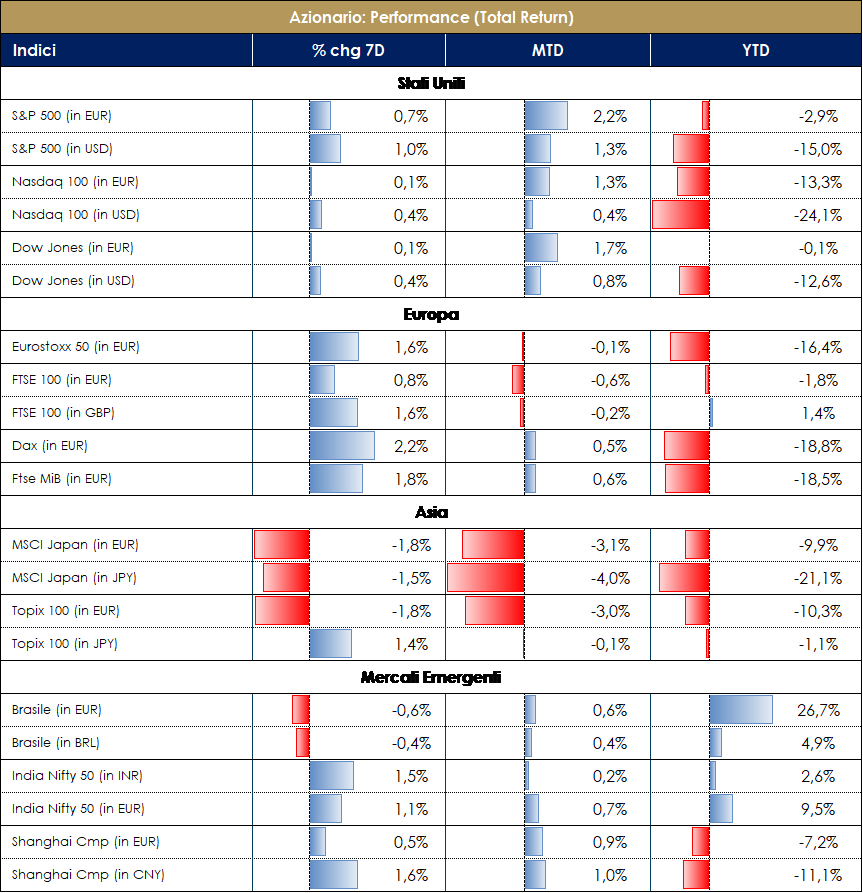 Settimana molto scarica di newsflows sulle singole società, terminata la reporting del secondo trimestre e in attesa che prendano il via le numerose conferenze previste nei mesi di settembre/ottobre. Il focus è rimasto ancora una volta sui dati macroeconomici e soprattutto sugli annunci delle banche centrali, ECB in particolare. La pressione ribassista sui mercati azionari statunitensi ed europei si è decisamente ridotta nelle ultime sedute, con in particolare i mercati azionari del vecchio Continente che hanno ben digerito il maxi-rialzo di 75bps dei tassi di interesse nonché la prospettiva di ulteriori rialzi nei prossimi meetings; l’esito della riunione ECB ha impattato positivamente soprattutto il settore bancario che beneficia del rialzo dei tassi e dell’assenza (perlomeno per ora) di un tetto alla remunerazione delle riserve attraverso un “reverse tiering” che qualcuno si aspettava; questo consente alle banche di supportare ulteriormente il margine di interesse grazie all’asimmetria TLTRO yield/cost. Attenzione particolare anche per l’annuncio atteso sulle misure di emergenza che verranno adottate per limitare l’impatto degli elevati prezzi dell’energia su consumatori e imprese. Il mercato azionario americano si avvia a chiudere la settimana (corta) con una performance dello S&P intorno al 3%, trainata da Copper +12%, Automotive manufacturers +9% e Health Care Facilities +7%; performance peggiore per Cable&Satellite -2%, Packaging Food -1% e Tracking -1%; sui singoli nomi migliori performance per Regeneron Pharma +27%, Solaredge Tech +17% e Albemarle 14%; performance peggiori per Mccormick&co -5.5%, Occidental Petroleum -5% e Church&Dwight -4%. Chiusura settimanale positiva anche per l’indice Nasdaq100, a +3% circa, guidato da Zscaler +24%, Docusign +16% e Dexcom +12%; i peggiori Kraft -3%, Comcast -3% e Old Dominion -3%. L’indice europeo SXXP si avvia a chiudere a +1%, guidato da Basic Resources +3.5%, Banche +3% e Media +2%; settori peggiori Energy -2%, Auto -1.5% e Telecom -1%; a livello di singola società Delivery Hero +16%, Genus +15% e Bank of Ireland +12% le migliori; Ubisoft Entertainment -17%, Atos -15% e Kion -11% le peggiori. Chiusura flat per l’indice FTSE Mib con banche top performers Intesa, Fineco, e Unicredit +4.5%; Telecom Italia -6%, Davide Campari -3.5% e Eni -3.5%; indice delle Mid Cap Italiane a circa -1%, con Intek +11%, Wiit +7% e Cir +6% tra le migliori; GVS -17%, Seco -12% e Sabaf -9% tra le peggiori. VIEW STRATEGICA La view sul comparto azionario continua ad essere costruttiva per un trimestre che, pur con una certa volatilità, presenta una buona crescita degli utili e una stagionalità attraente per le attività finanziarie rischiose. Tra i rischi a questo scenario un certo grado di rallentamento macroeconomico, la normalizzazione della politica monetaria (che potrebbe risentire di un tasso di inflazione più alto più a lungo) e i timori sul mercato immobiliare cinese. Azionario USA: I trend di lungo termine proseguono su traiettorie al rialzo sostenibili, il ciclo economico (pur in rallentamento) è ancora favorevole e le condizioni finanziarie rimangono accomodanti. Nell’attuale contesto geopolitico l’area statunitense appare favorita alla luce di 3 fattori: l’indipendenza energetica la rende meno fragile ai rialzi dell’oil, il livello dell’interscambio commerciale con la Russia è modesto ed infine la composizione dell’indice azionario la rende più resiliente agli attuali rischi. Azionario Europe: L’attuale situazione geopolitica e la dipendenza energetica dell’EMU suggeriscono di portare a neutrale l’esposizione sul settore. L’incertezza geopolitica resta, tuttavia, bilanciata da politiche fiscali espansive, marcato accomodamento monetario e dalla debolezza dell’EURO. Elementi di rischio da monitorare sono legati a un possibile inasprimento delle operazioni militari e alle conseguenti contromisure economiche