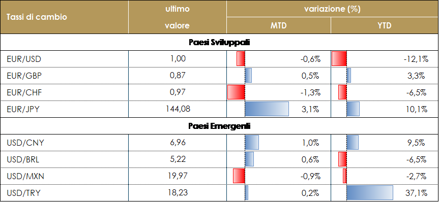 TASSI DI CAMBIO Il tasso di cambio EUR/USD, dopo aver toccato il minimo degli ultimi 20 anni a 0.9865, è tornato sopra la parità sull’attesa della riunione della BCE prima e poi sull’annuncio di altri rialzi del costo del denaro nei prossimi mesi. L’euro resta in queste sedute guidate dal differenziale di politica monetaria rispetto agli Stati Uniti e dall’andamento della crisi energetica. L’aspettativa di una chiusura definitiva del gasdotto Nord Stream 1 e il conseguente aumento del rischio di razionamento dell’energia nell’Eurozona durante il prossimo inverno, hanno alzato rischi di recessione nell’Area, penalizzando nel complesso la moneta unica. Nei prossimi mesi molto dipende da come la politica fiscale europea affronterà gli shock energetici. Sarà importante trasformare, almeno temporaneamente, il meccanismo di formazione dei prezzi all’ingrosso dell’elettricità utilizzando una formula che guardi più al costo medio di ciascuna fonte energetica. Resta debole la sterlina nonostante l’elezione di Liz Truss a nuovo Primo Ministro, penalizzata dai timori di un rallentamento della crescita economica e dall’inflazione elevata. Lasciato alle spalle il rischio politico, l’attenzione dei mercati si concentrerà ora sulla politica fiscale (quanto espansiva sarà la politica del nuovo governo) e il compromesso che il Regno Unito deve cercare con l’UE sull’accordo con l’Irlanda del Nord. A cura del team obbligazionario di Mediobanca SGR