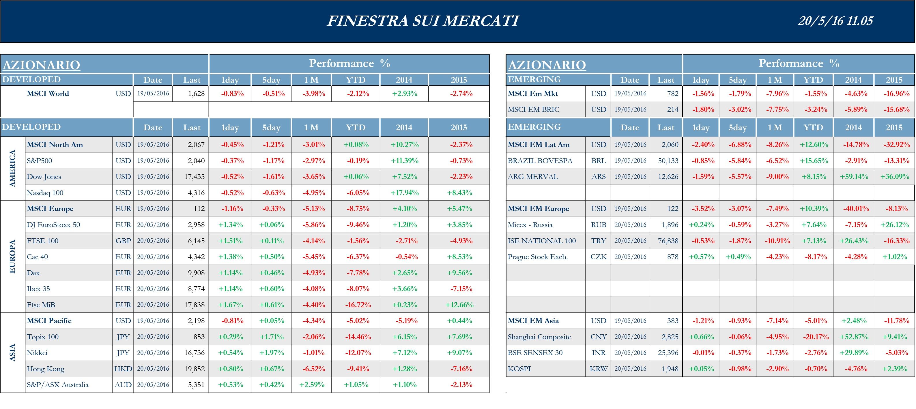 Focus sull’inflazione di aprile anche negli USA: il Cpi registra lo scorso mese un aumento dello 0.4% su mese e dell’1.1% su anno, rispettivamente leggermente meglio e in linea con il consensus. Il dato mensile rappresenta il maggior aumento in oltre tre anni, aiutato soprattutto dagli incrementi nei prezzi di petrolio e affitti. Ottimi anche i numeri della produzione industriale, in crescita dello 0.7% mensile a fronte del +0.3% stimato, e le indicazioni in arrivo dal mercato immobiliare, con le nuove costruzioni abitative a 1172k, a fronte di un consensus di 1125k. Lo scorso venerdì, segnali incoraggianti sull’andamento del Q2 anche per quanto riguarda i consumi: le vendite retail sono salite in aprile dell’1.3% su mese, a fronte del +0.8% previsto dagli analisti, incremento più rilevante dell’ultimo anno.