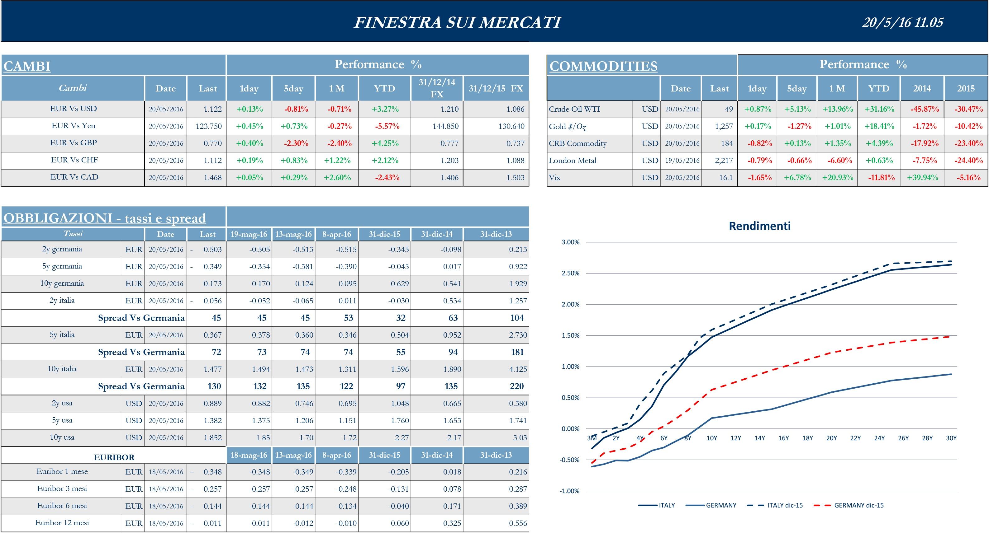 Nelle telecomunicazioni, Telecom alza le previsioni di tagli dei costi da € 600 mln a € 1.6 mld al 2018, ma conferma gli obiettivi di Ebitda 2016 e di rapporto debito Ebitda al 2018 indicati a febbraio, mentre nel primo trimestre dell’anno calano i margini per la debolezza in Brasile e sul mercato interno. La società sembra aver messo in pausa il processo di conversione delle azioni di risparmio e la cessione delle torri Inwit e aver spostato l’attenzione sulla disciplina dei costi. In UK Vodafone termina l’anno con una perdita di £ 3.8 mld rispetto a un utile di £ 5.86 mld del corrispondente periodo del precedente anno, perdita legata soprattutto al mutato orizzonte temporale con cui saranno realizzate o assorbite le attività fiscali differite iscritte nei precedenti esercizi. Vodafone Italia lancia nel contempo il servizio in fibra a 500 mega a Milano, Torino e Bologna, con un piano di offerta su fibra ottica che proseguirà grazie alla partnership con Enel Open Fiber. Enel, dal canto suo, avrebbe offerto per Metroweb € 80 mln, ma si prevede che l’offerta possa salire a € 820 mln per essere adeguata a quella concorrente di Telecom. Prosegue anche il newsflow su Rcs, con la cordata di Andrea Bonomi e quattro tra i principali soci, Mediobanca, Diego Della Valle, Unipolsai e Pirelli, che hanno lanciato un’Opa in contanti a € 0.7 per azione alternativa all’offerta carta contro carta promossa da Urbano Cairo, appoggiato a sua volta da Intesa San Paolo.