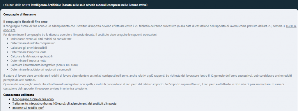 Com’è possibile riscontrare dalla ricerca, l’assistente virtuale individua i punti salienti della disciplina, riportando la normativa di riferimento, la scadenza e gli elementi necessari al compimento dell’adempimento.